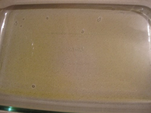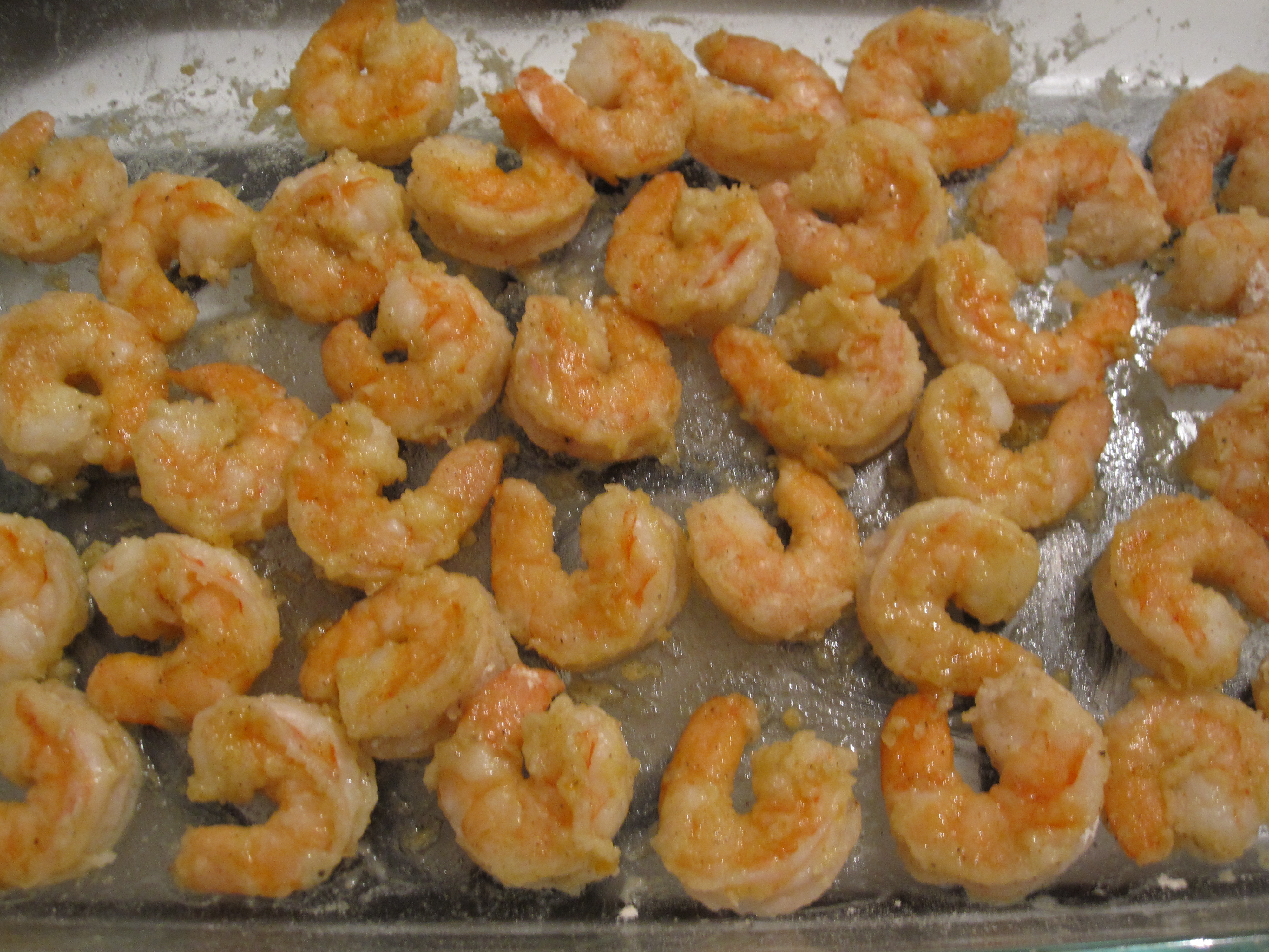 Toss shrimp in flour with some seasonings like garlic powder and cayenne and place them in a well oiled baking dish.