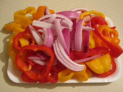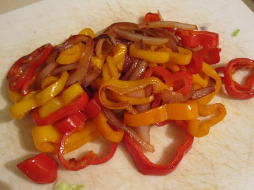 These veggies were on sale by the register and were pre-cut which was nice. I sauteed them until soft and let them cool a bit before going on the salad.