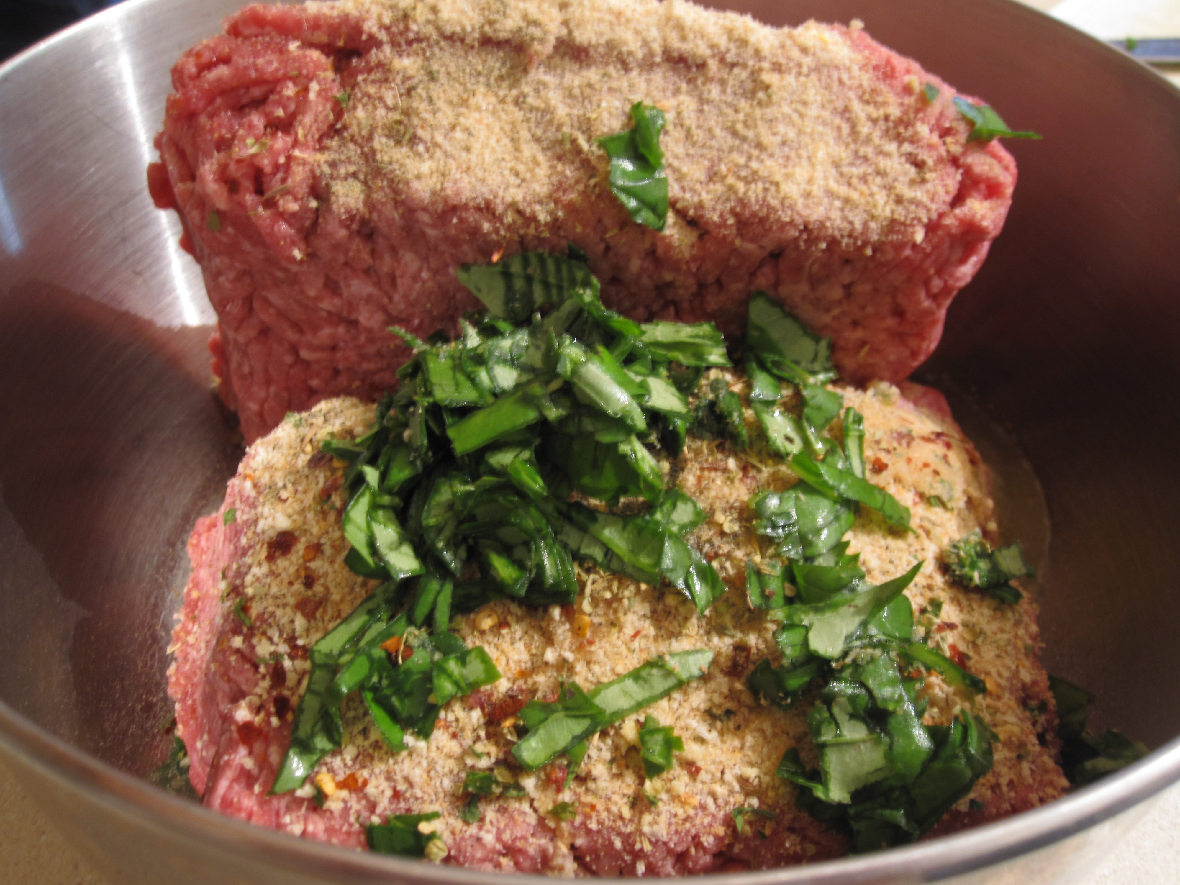 It started with our standard meatball recipe but also included some fresh basil from the garden. There was an egg in there too that is not seen. After hand mixing this and forming the balls, I definitely had reservations and concerns about putting the somewhat delicate meatballs on the grill. I decided to put them on the upper bun toaster shelf and made sure it was thoroughly oiled.