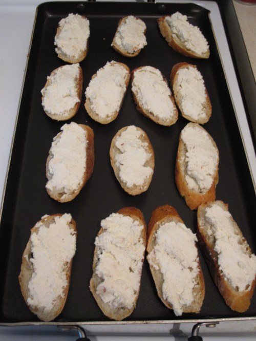 The mixture of weak curds was pretty similar to a ricotta but thicker. I added salt, pepper, garlic powder, and a few red pepper flakes to the spread. Here it is being used as it’s namesake, a spread on a diagonally cut baguette. I oiled a griddle pan and put the cheesed breads down.