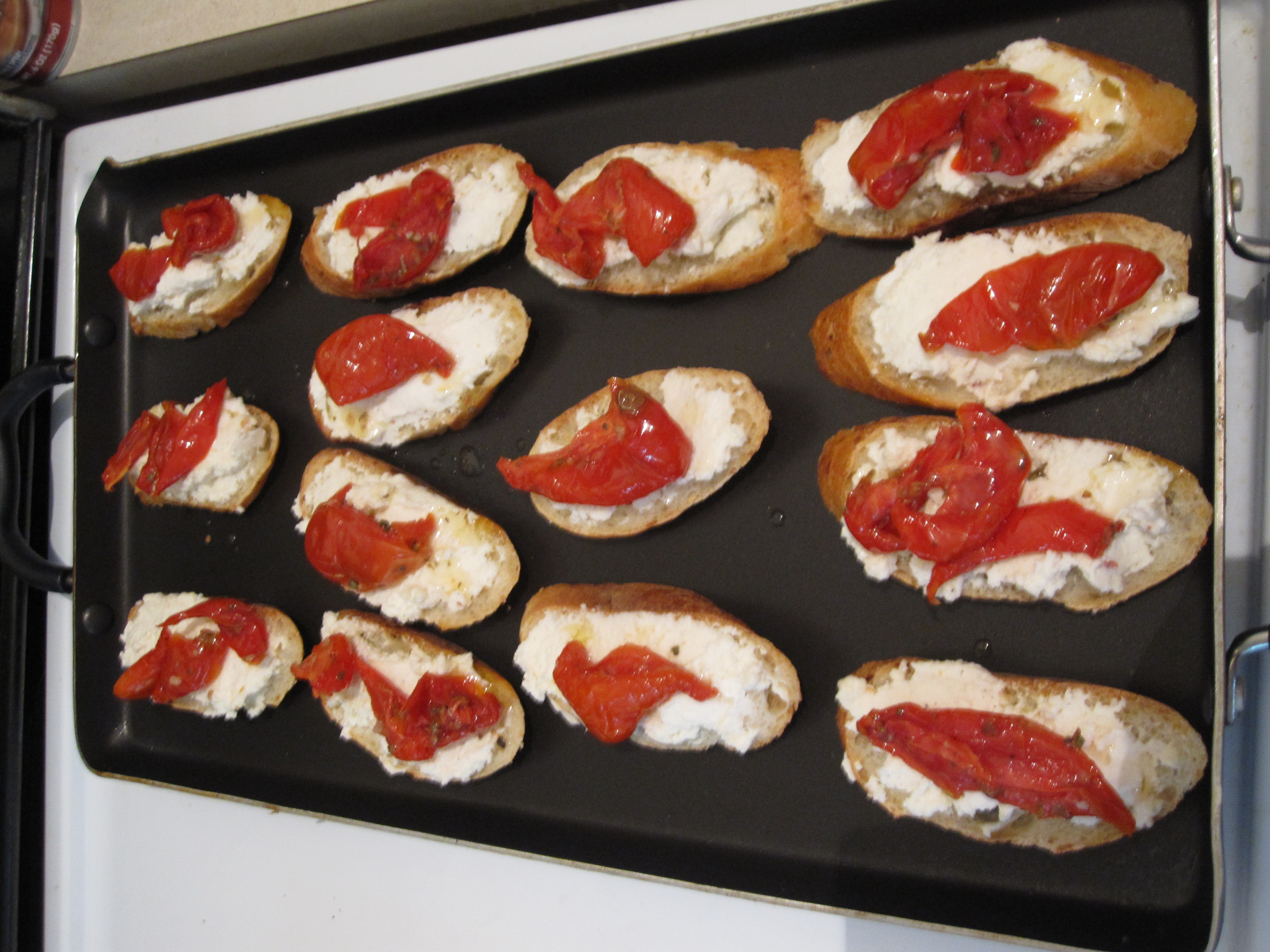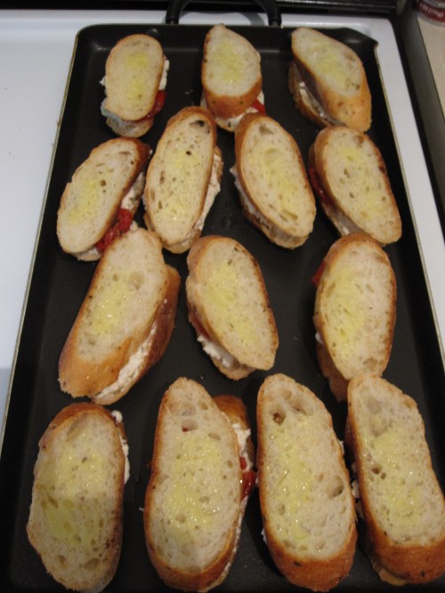 Then added store bought roasted tomato slices. I didn’t have any cash at the bakery when buying the baguette and there was a $5 minimum so I got the tomatoes and ended up just cents over that min. Honestly I was just going to originally bring the cut bread with the cheese spread as a dip and got the idea to use the end pieces and make a quick grilled sandwich for myself and figured why not do, well what I am showing you right now.