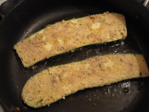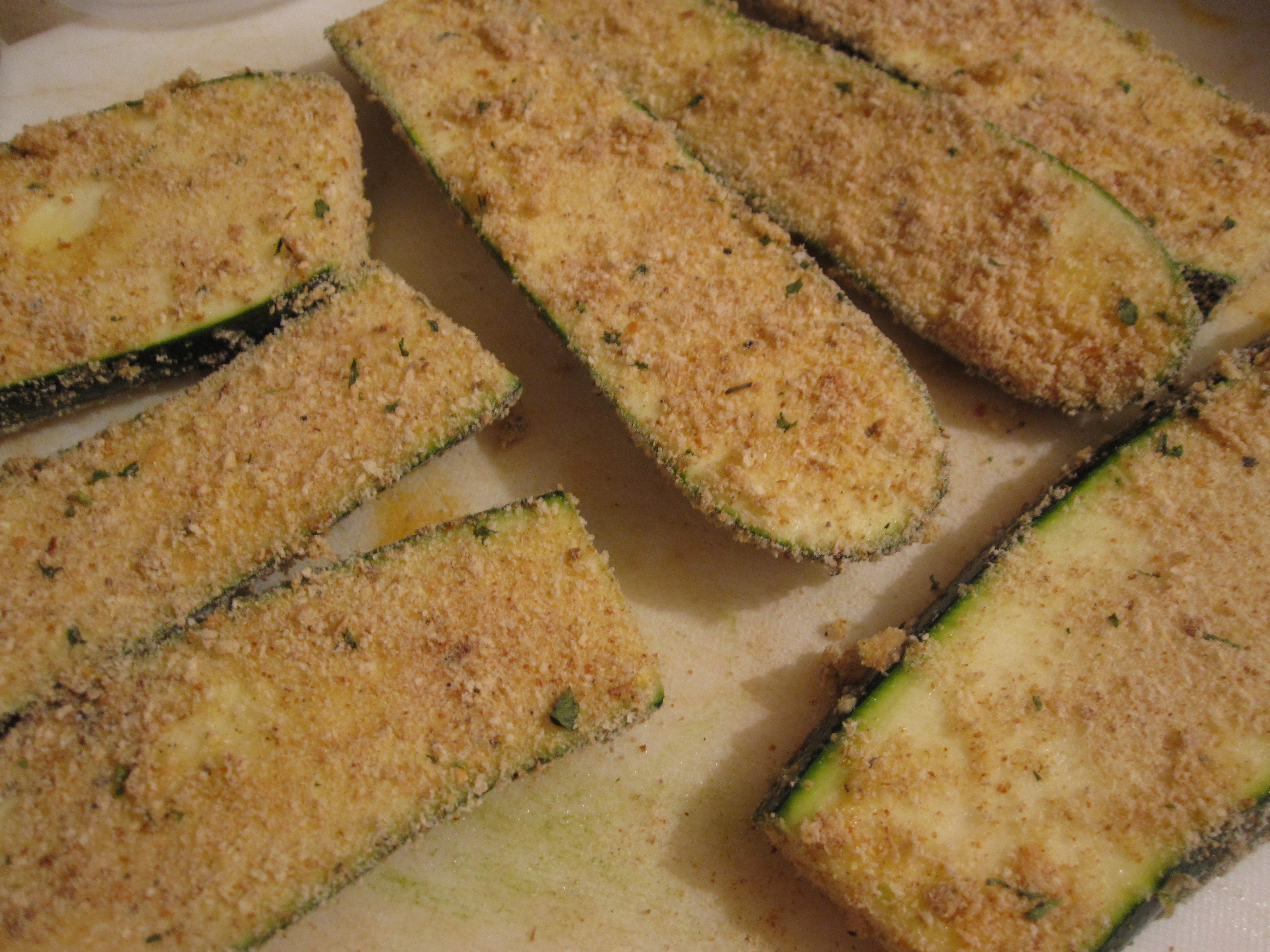 Next, bread the zucchini using a beaten egg and some breadcrumbs.