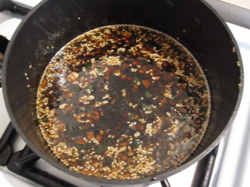 Then I added the liquids and sesame seeds and continued to simmer for a while. The sauce wasn’t as thick as I had in mind because it to be a thick glaze that would stick to the chicken well and be able to be basted easily while on the grill. So I added some cornstarch mixed with water and the sauce thickened to the perfect, back of a spoon covering consistency.