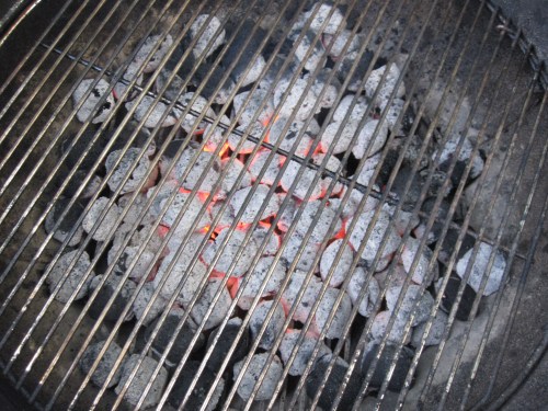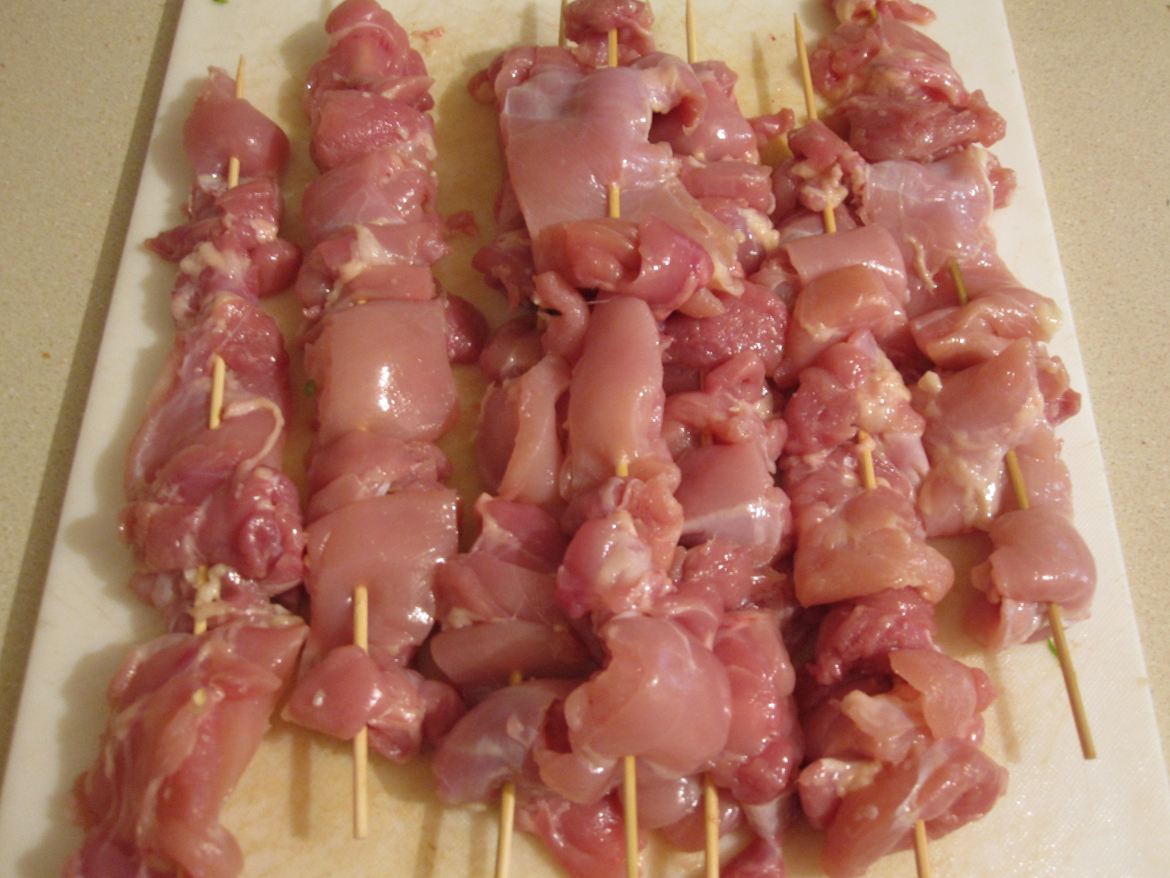 I trimmed the boneless skinless chicken thighs a bit as they are fairly fatty and skewered them on water soaked bamboo skewers and got the grill started. Since we were going all out on the sauce and all, I wanted to go all out with the grill and use charcoal. A hot charcoal grill that is ready to be used is a lovely site.