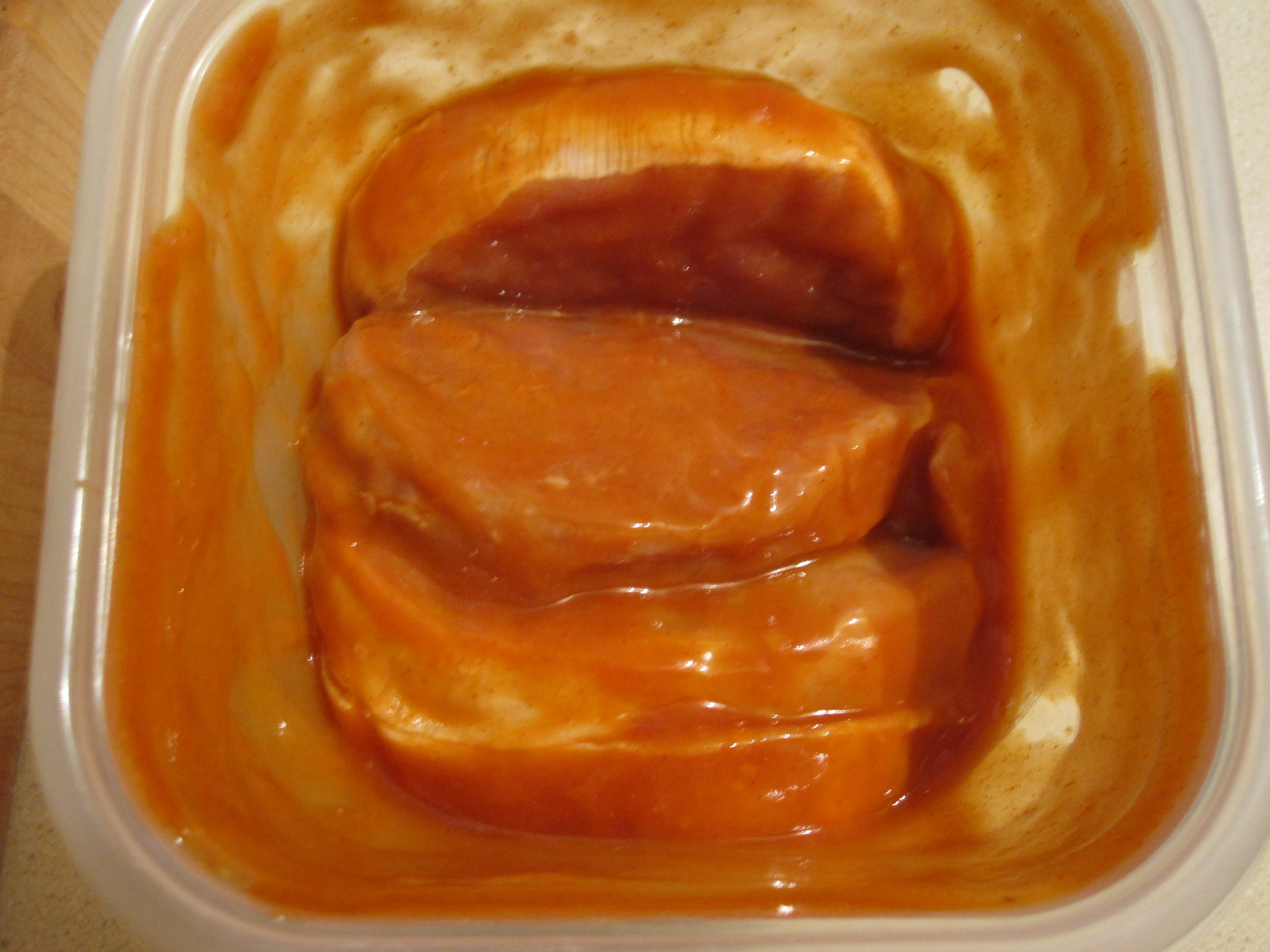 I marinated the chops for a few hours before grilling. Had to taste the sauce out of the bottle too, which was good. It says hot, but ehhh. I usually push it to the limit with my heat seeking taste though. A former roomate even described my taste as aggressive.