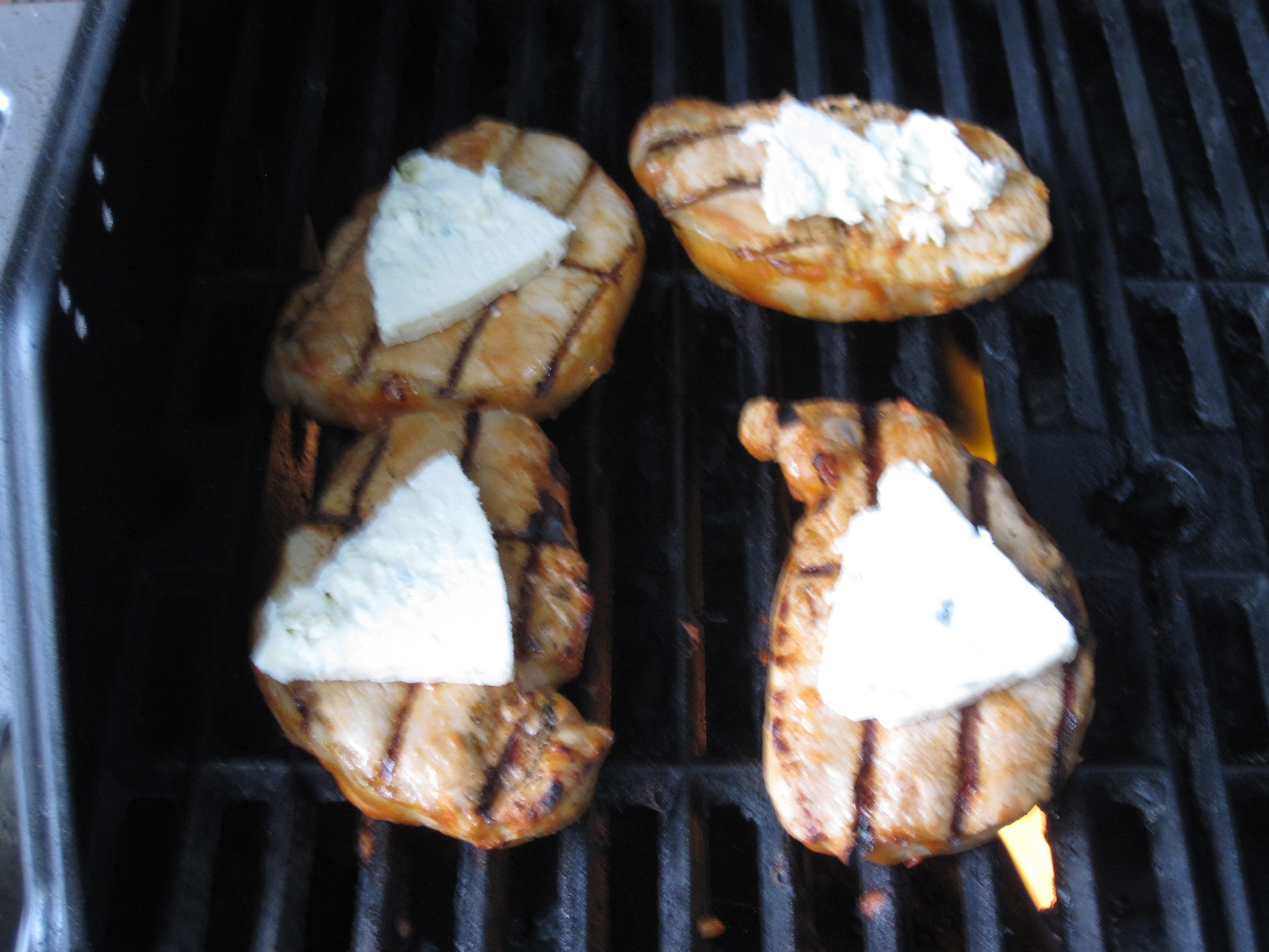 As a Foodbuzz participant (yeah, over to the right there) we receive promotions in return for trying them out and letting you know about them like the recent Godiva coffee. This summer we received KC Masterpiece Buffalo Marinade. I wanted to do something different than the cliche buffalo chicken and had some boneless pork chops on hand with fresh blue cheese and a nice summer grill.