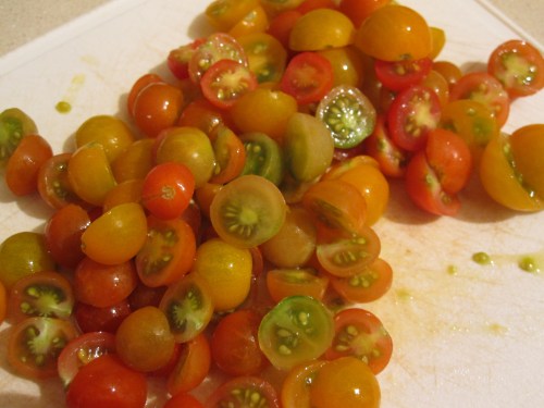 I slice them in half, which works since many of them are already starting to burst. It’s also a nicer bite then popping the whole tomato.