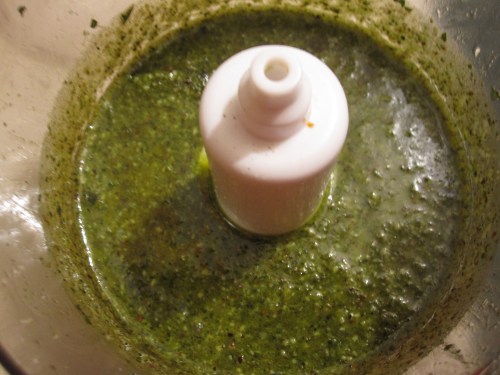 Next, I made the pesto. Lemon-basil, garlic, almonds, sharp provolone, and extra virgin olive oil. If you don’t have lemon-basil, simply substitute with regular basil and the juice of one lemon.