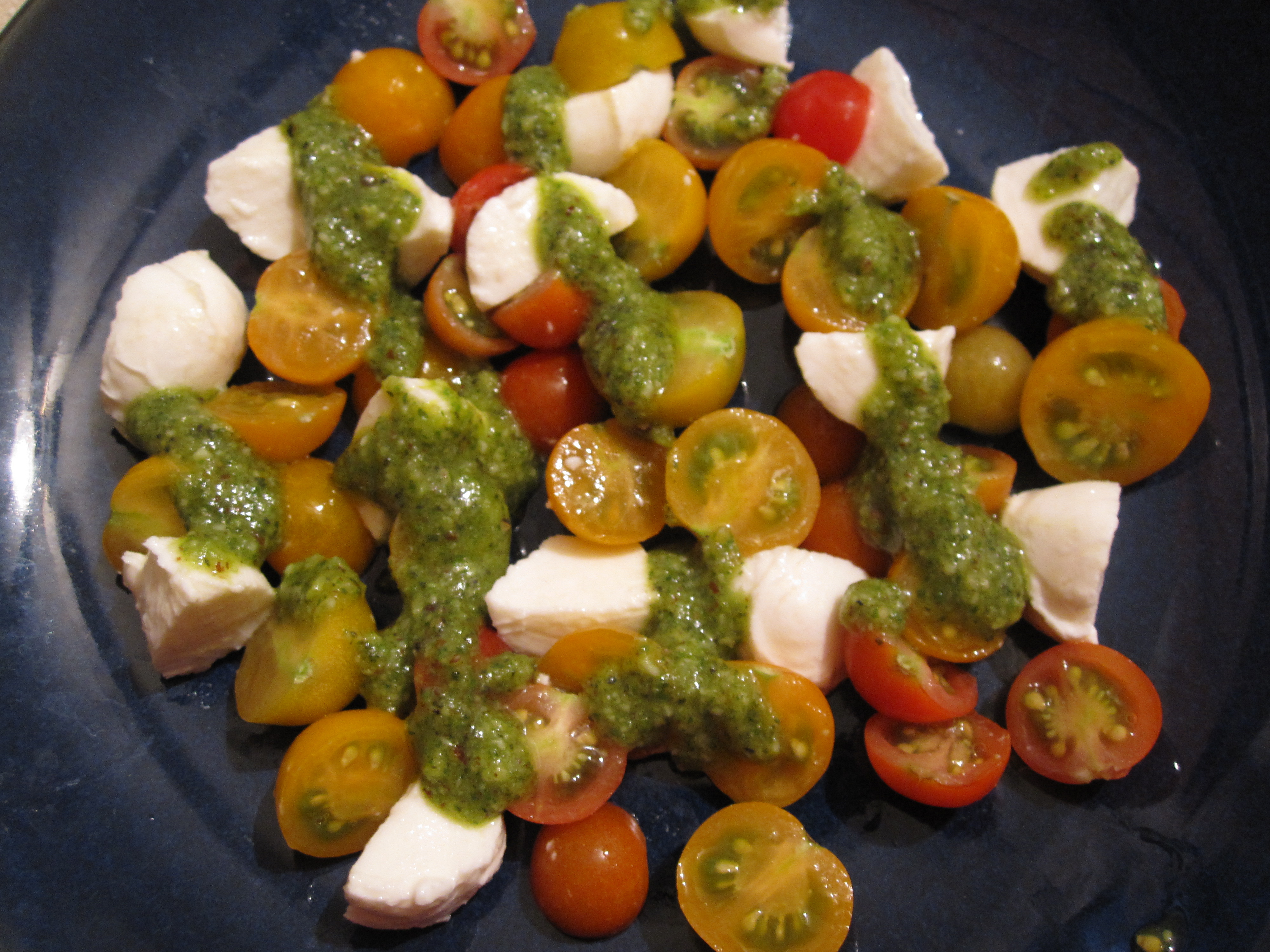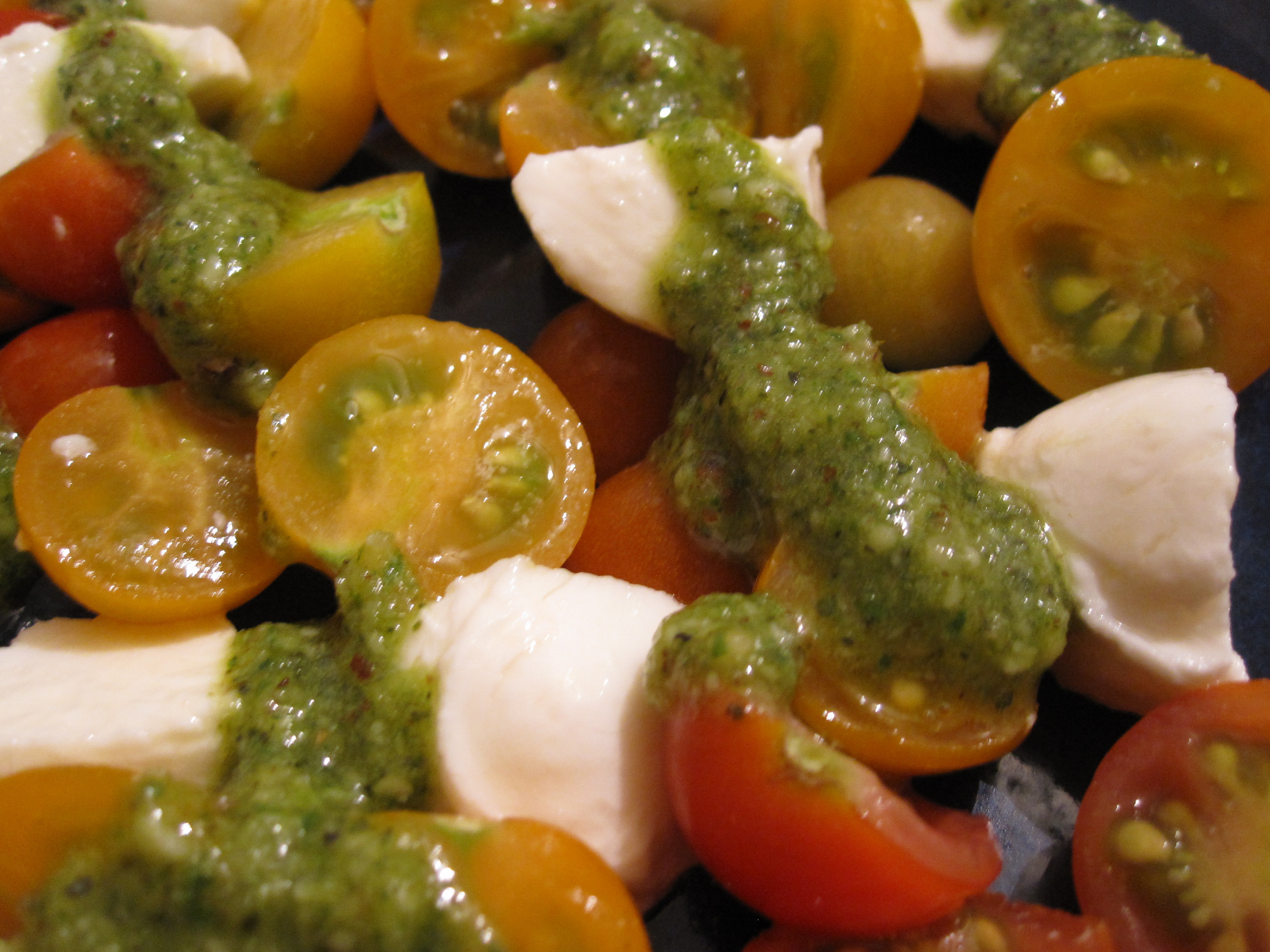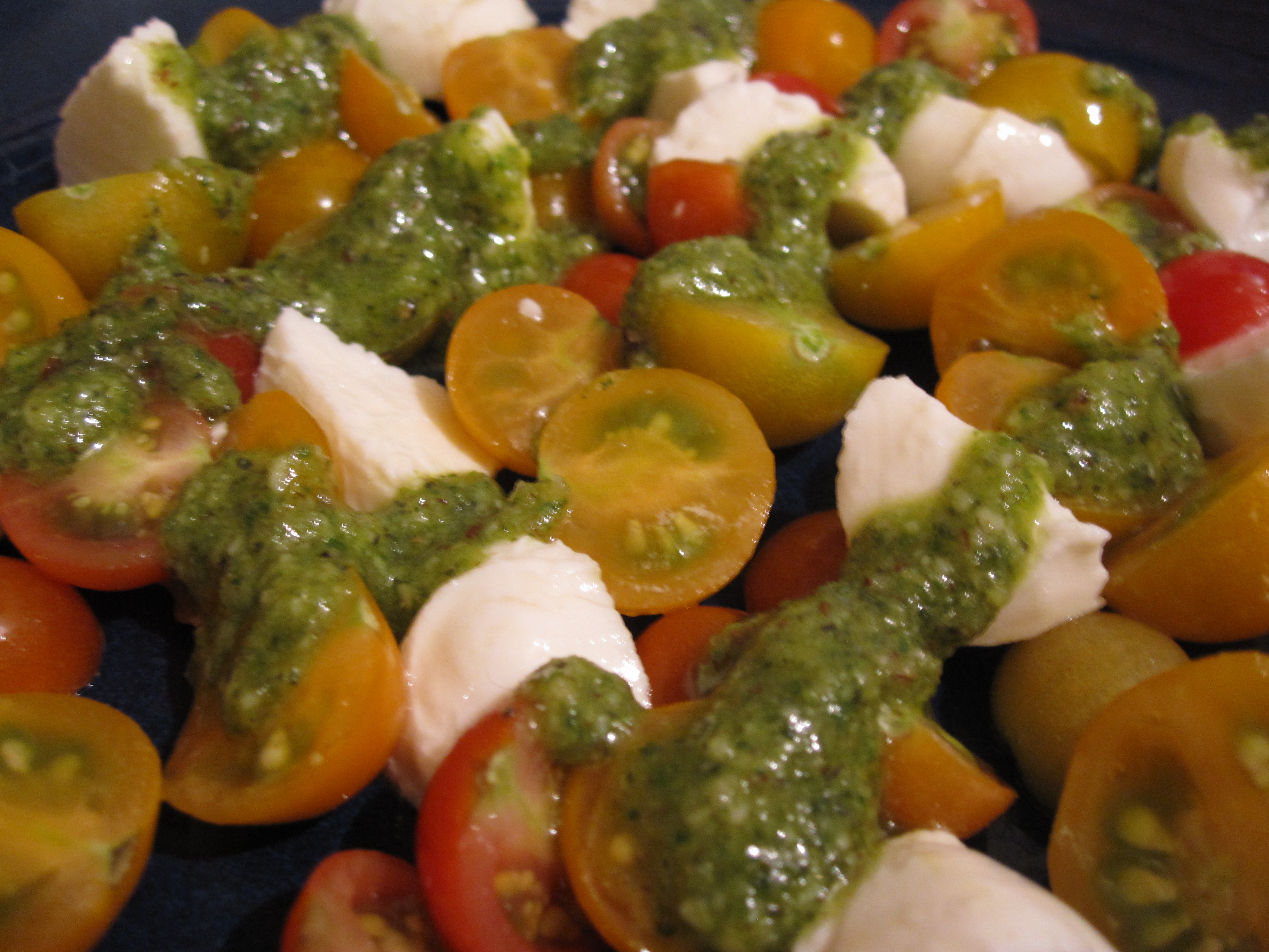 Simply arrange the tomato slices and mozzarella on small plates. Drizzle the pesto over the top and serve.