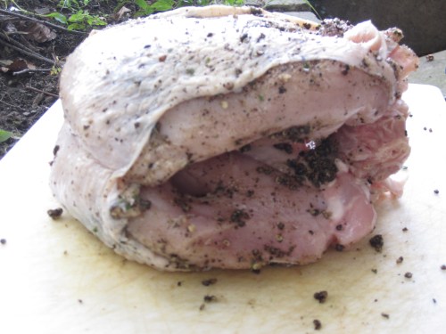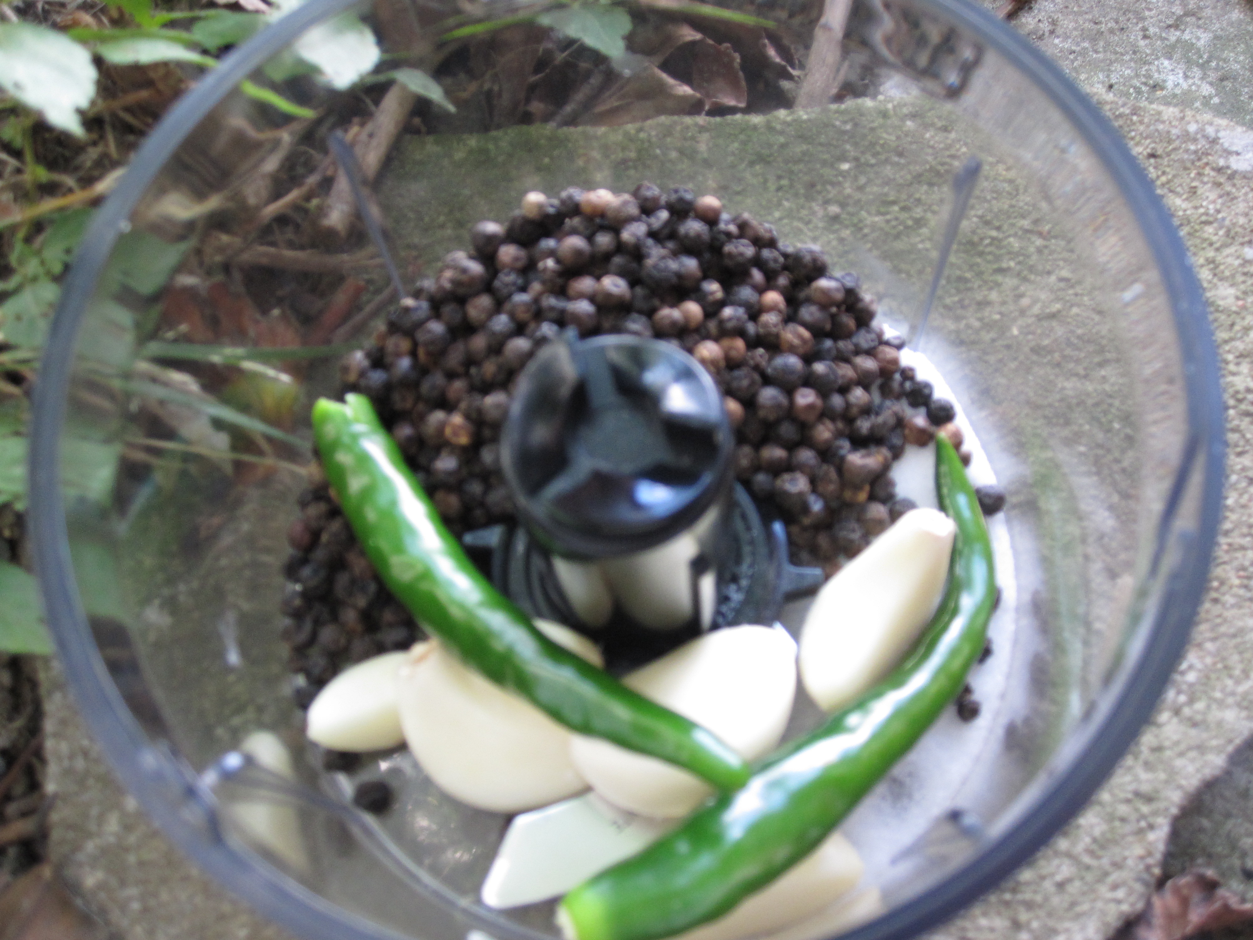 I started by making a rub for the turkey consisting of peppercorns, salt, garlic, and a few hot peppers from the garden.