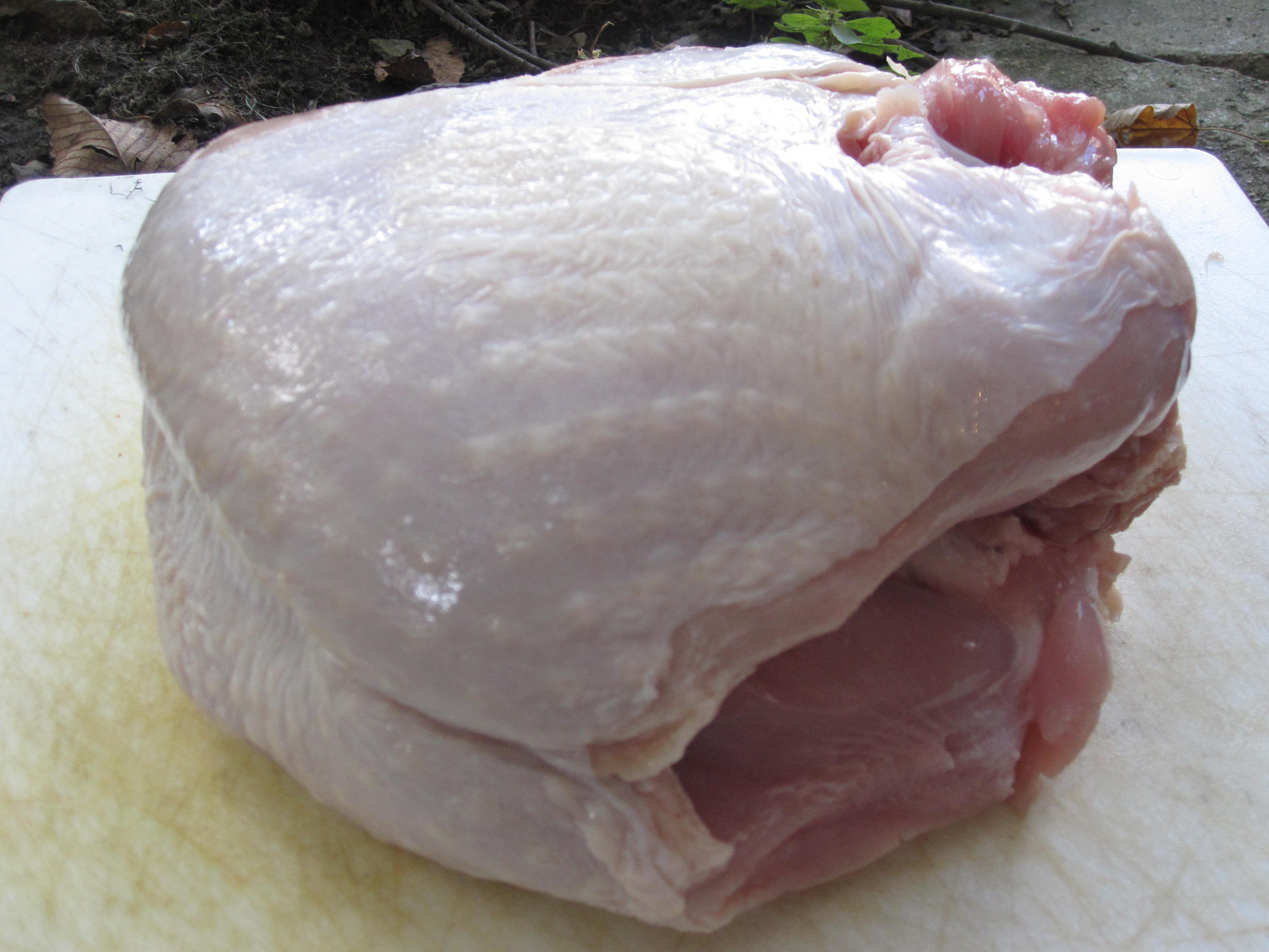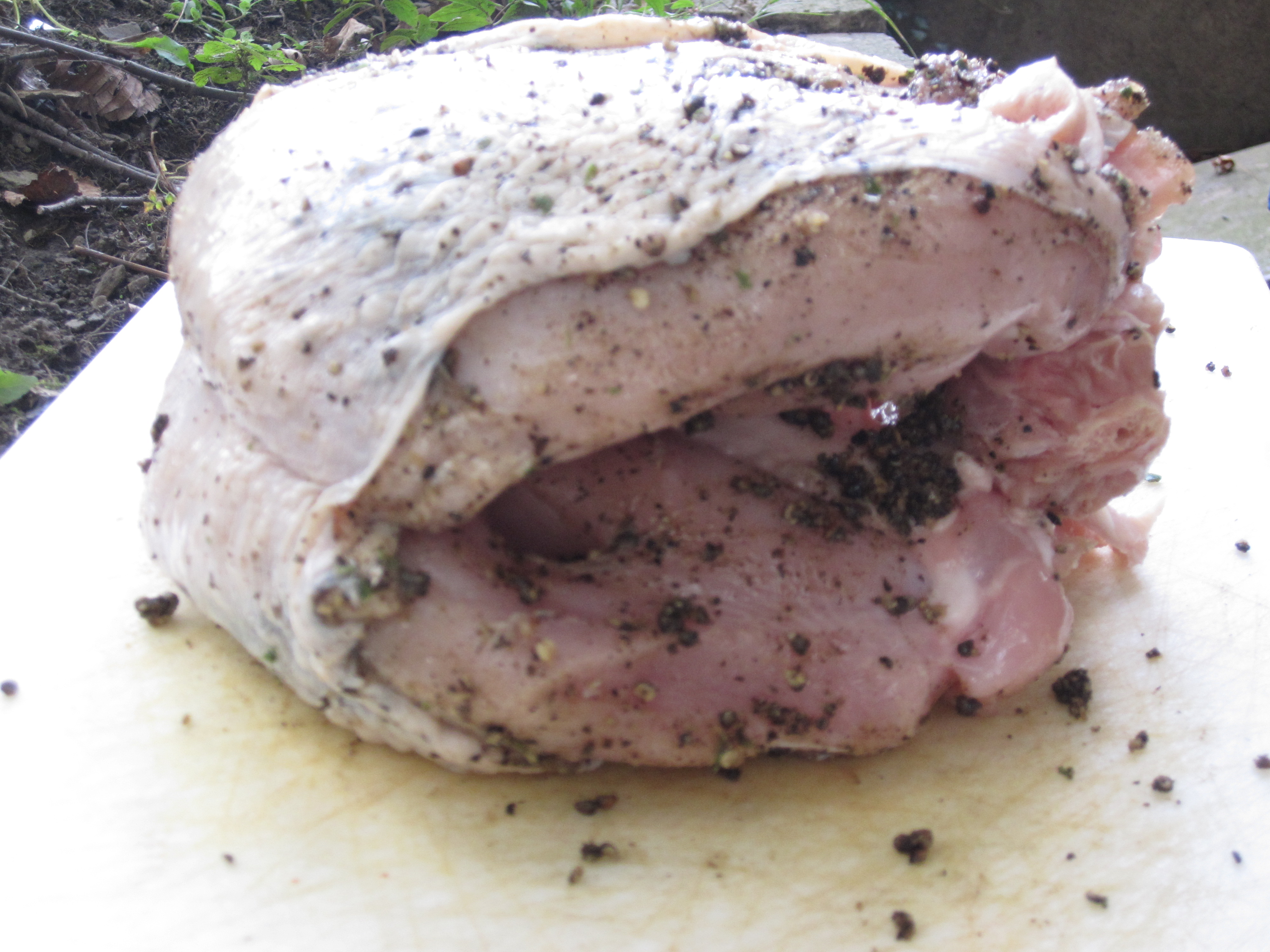 Wholey’s often has fresh turkey breast but this was a double breast and basically the torso of the turkey. I don’t know if they removed the wings and legs to sell separately or what. You usually don’t see this option in grocery stores. Either way they are delicious and versatile without having to commit to a whole turkey. I put the rub inside the cavity, under the skin, and on the outside so I covered it on every surface I could find.