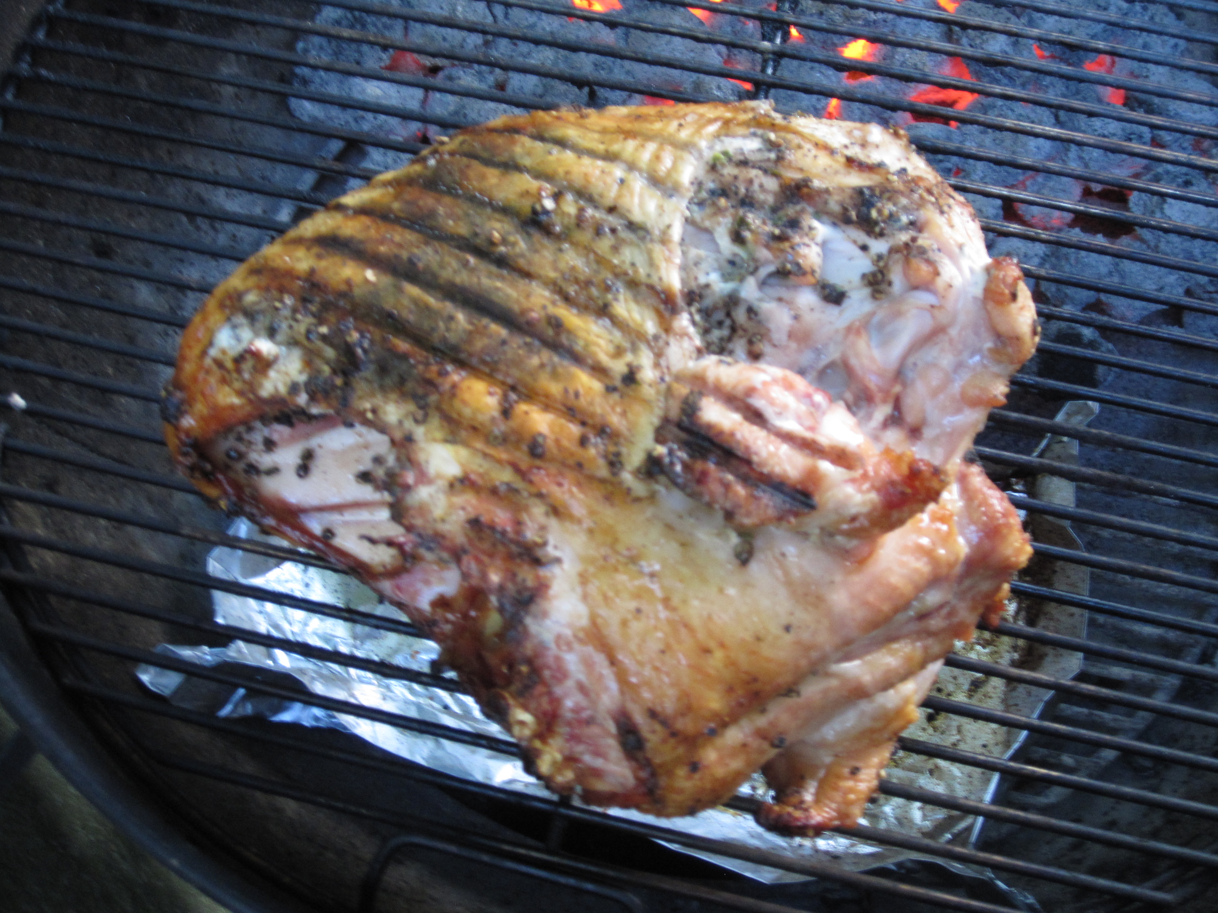 What exactly am I looking at you ask? This is obviously a turkey breast on an indirect heat charcoal grill with a blanket woven of bacon on top of it. Obviously. I wanted to squeeze in some good grilling as the season was about to close and a cheap turkey breast from Wholey’s (about $14 for this 8 pound double breast) offered a great opportunity. I have made this before by roasting the turkey and have indirect heat grilled a whole turkey, so the bacon was what differentiated this post from the others.