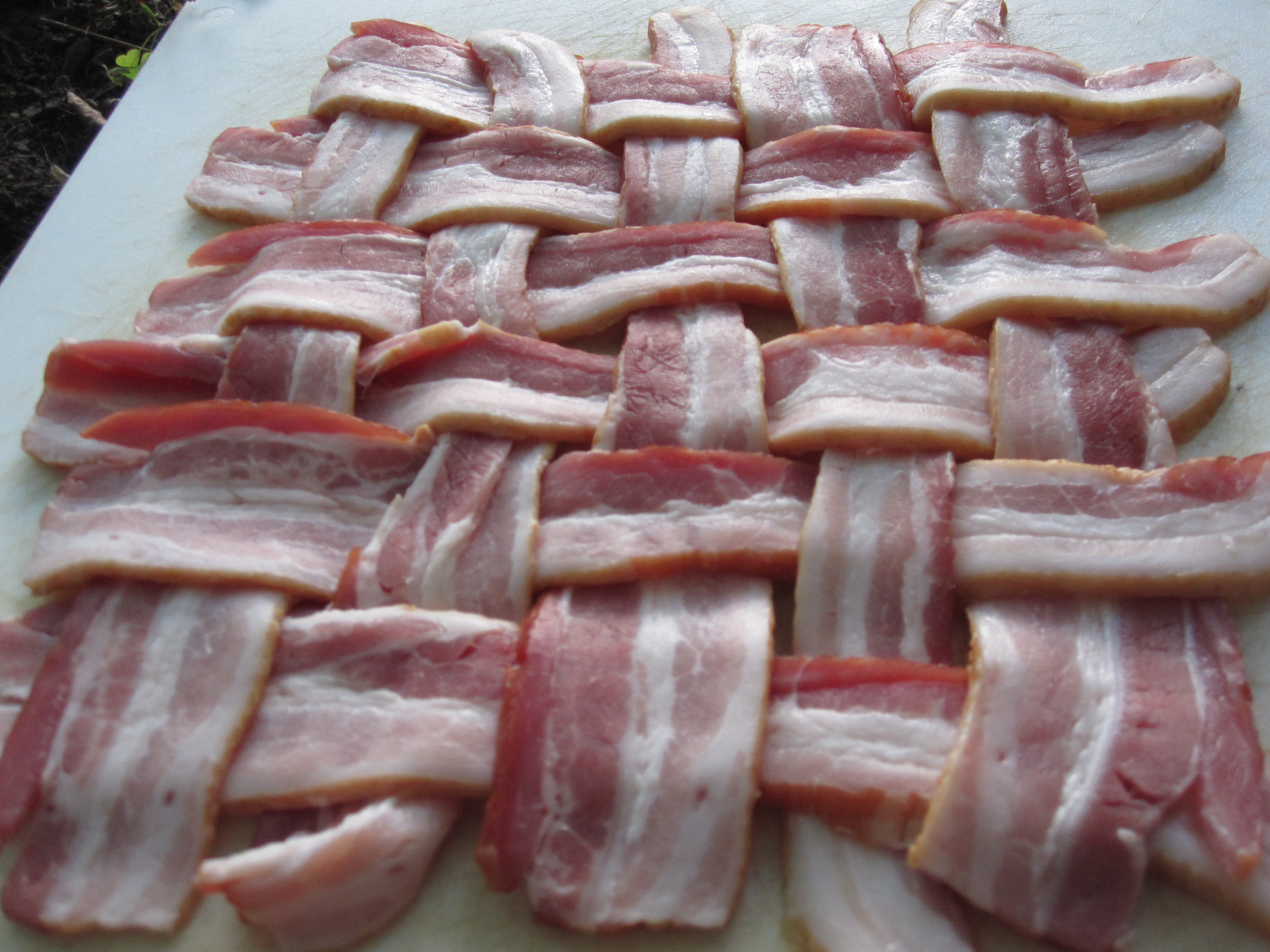 In the meantime, I took a 1lb package of bacon and wove the bacon into a mat. Everything about this was hilarious, beautiful, and naturally meant to be. My thinking was to flip the turkey like I did above and then cover with the bacon blanket for the second half of the cooking.