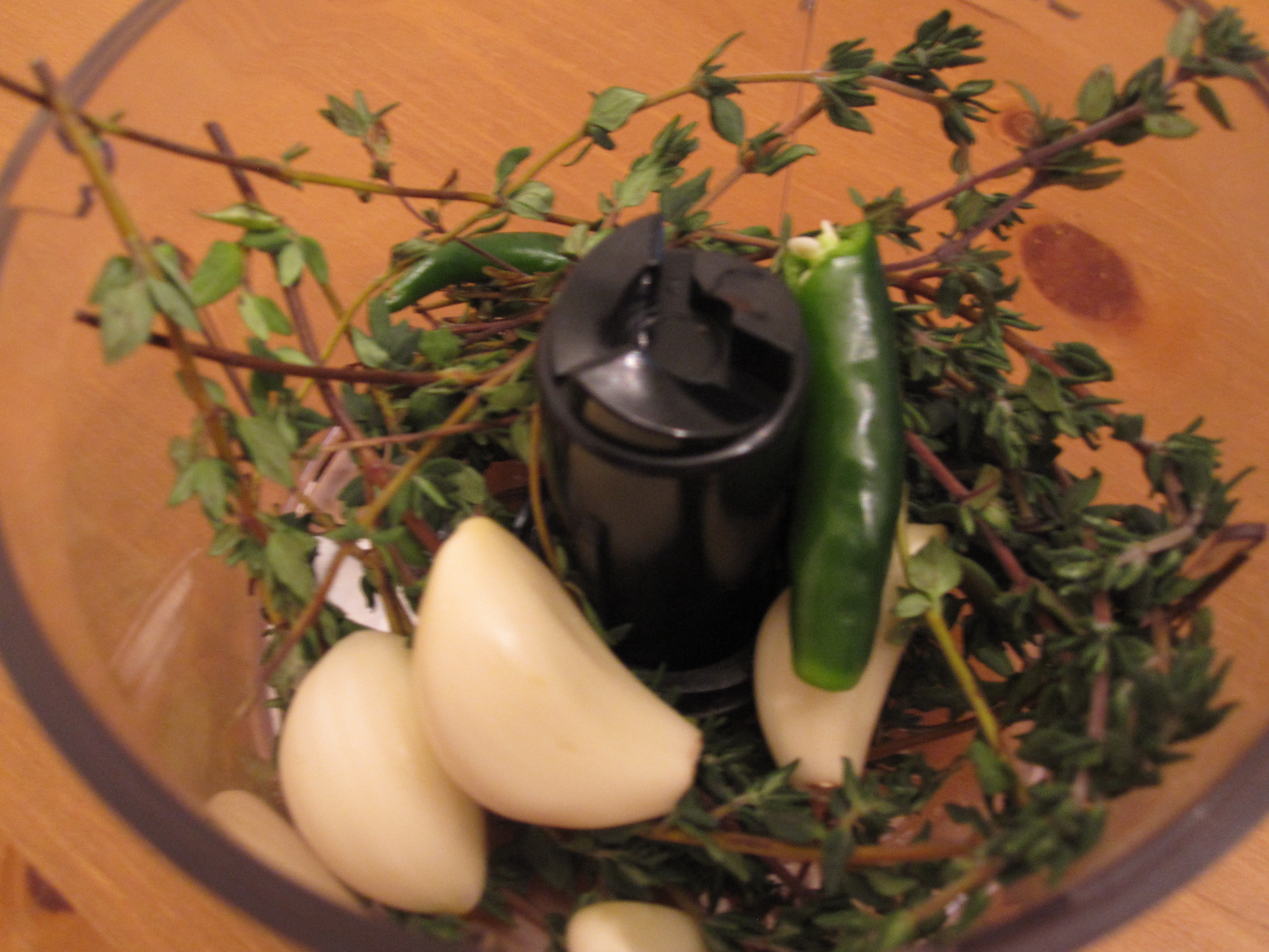 Here is the thyme with a bit of salt and pepper underneath, a few cloves of garlic, and a serrano pepper from the garden. I pureed them and then covered the pork chops to marinade for about 30 minutes before grilling.