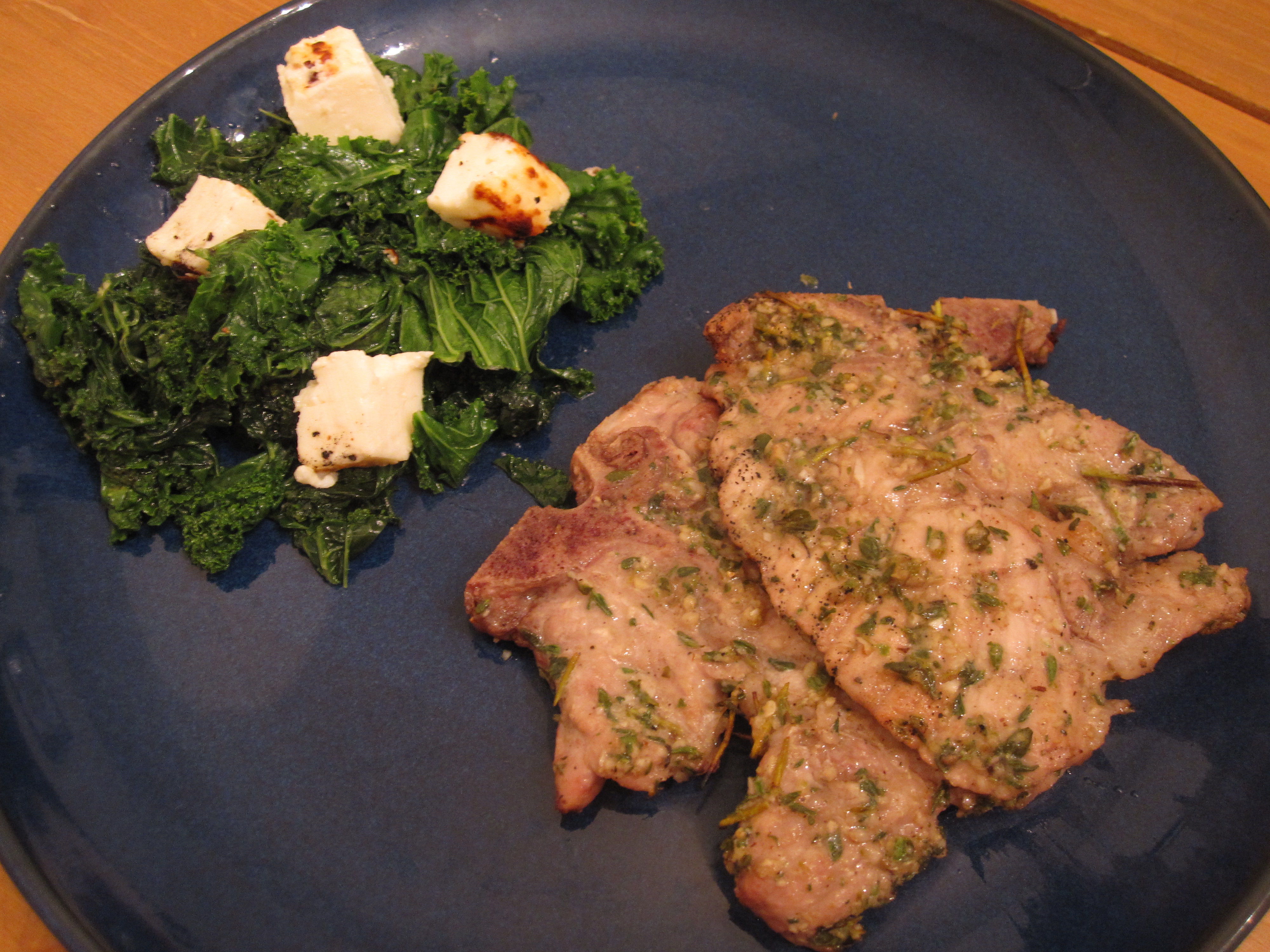 A few things are going on here (1) squeezing in mild autumn grilling, (2) using CSA thyme and kale, and (3) grilling cheese for the first time though I have wanted to for quite a while. I got some bone in pork chops in order to use some thyme that was nearing its end and also my mom gave me a package of havarti grilling cheese. Throw in some CSA kale and another fall themed meal easily came together!