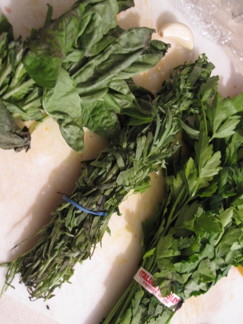 I used a 1/2 cup roughly chopped basil, 2 tablespoons chopped tarragon, and 1/2 cup roughly chopped parsley, since this is what we had. You can also see a clove of garlic hanging out up there as well.