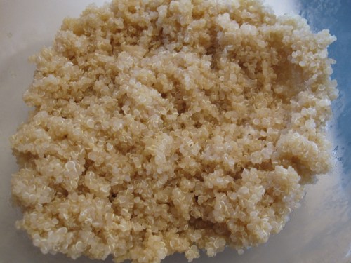 Quinoa cooks similarly to rice and you can actually make it in your rice maker if you’d like. I cook 1 part quinoa to two parts liquid, bring it to a boil. Lower to a simmer and cover for 12 minutes. Then fluff with a fork and it’s done. Once it’s cooked, set it aside and let it cool.