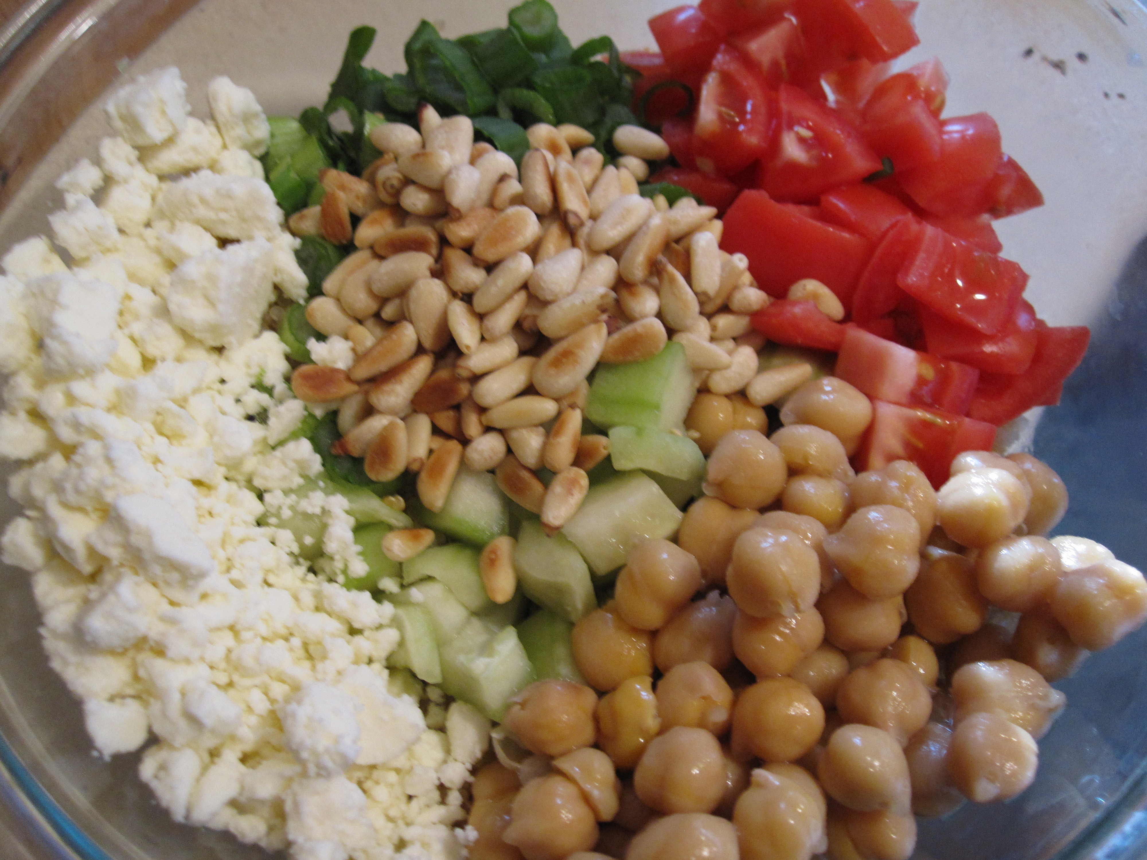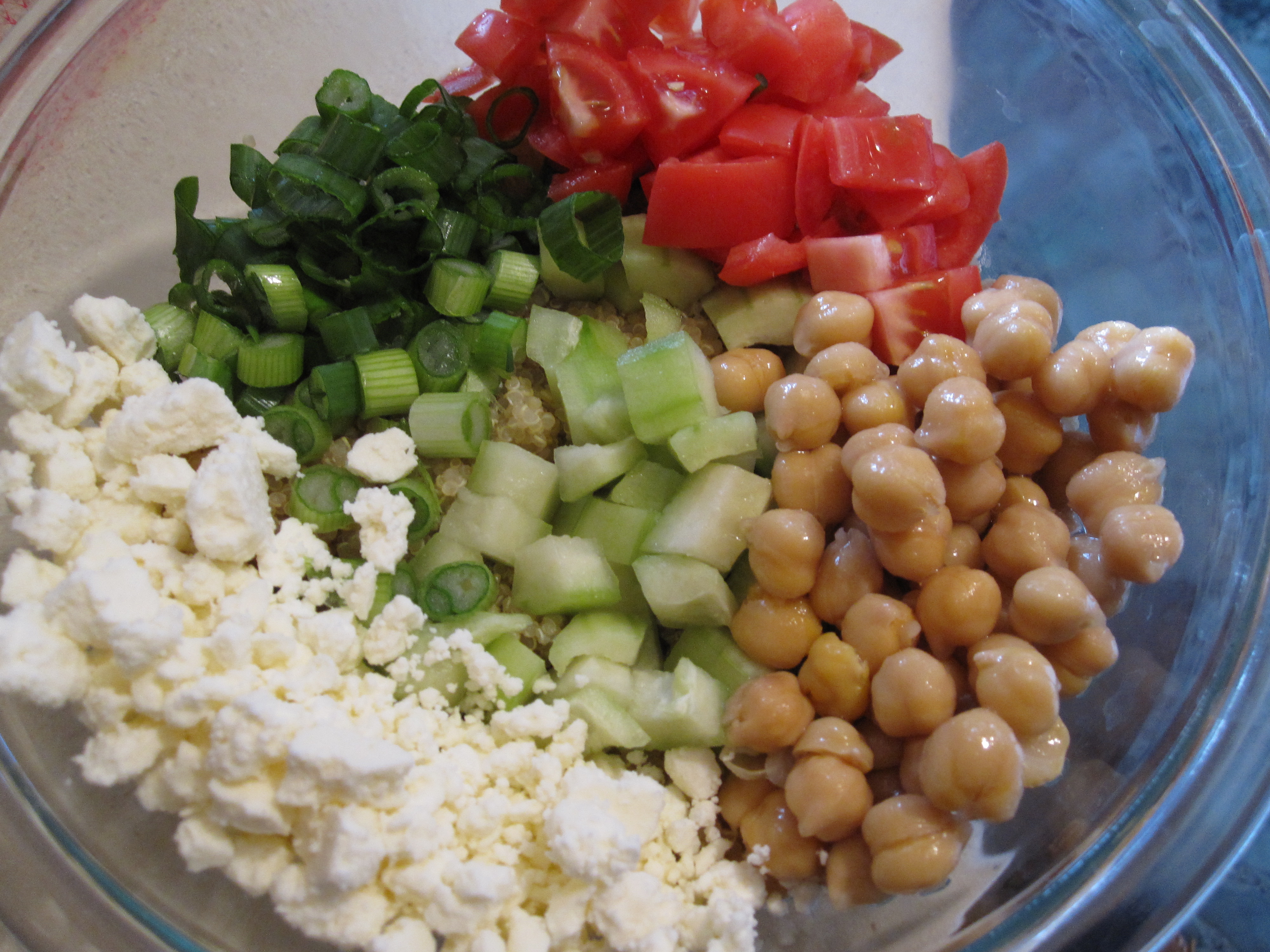 Meanwhile you can prep your other ingredients. In the mix here: diced tomatoes (seeded), diced cucumbers (seeded), chopped green onions, chickpeas, and feta cheese.