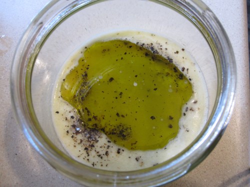 Next, it’s time to make a lemon vinaigrette, by mixing fresh squeezed lemon juice, extra virgin olive oil and a good dose of salt and pepper. Stir and pour over the quinoa and veg.