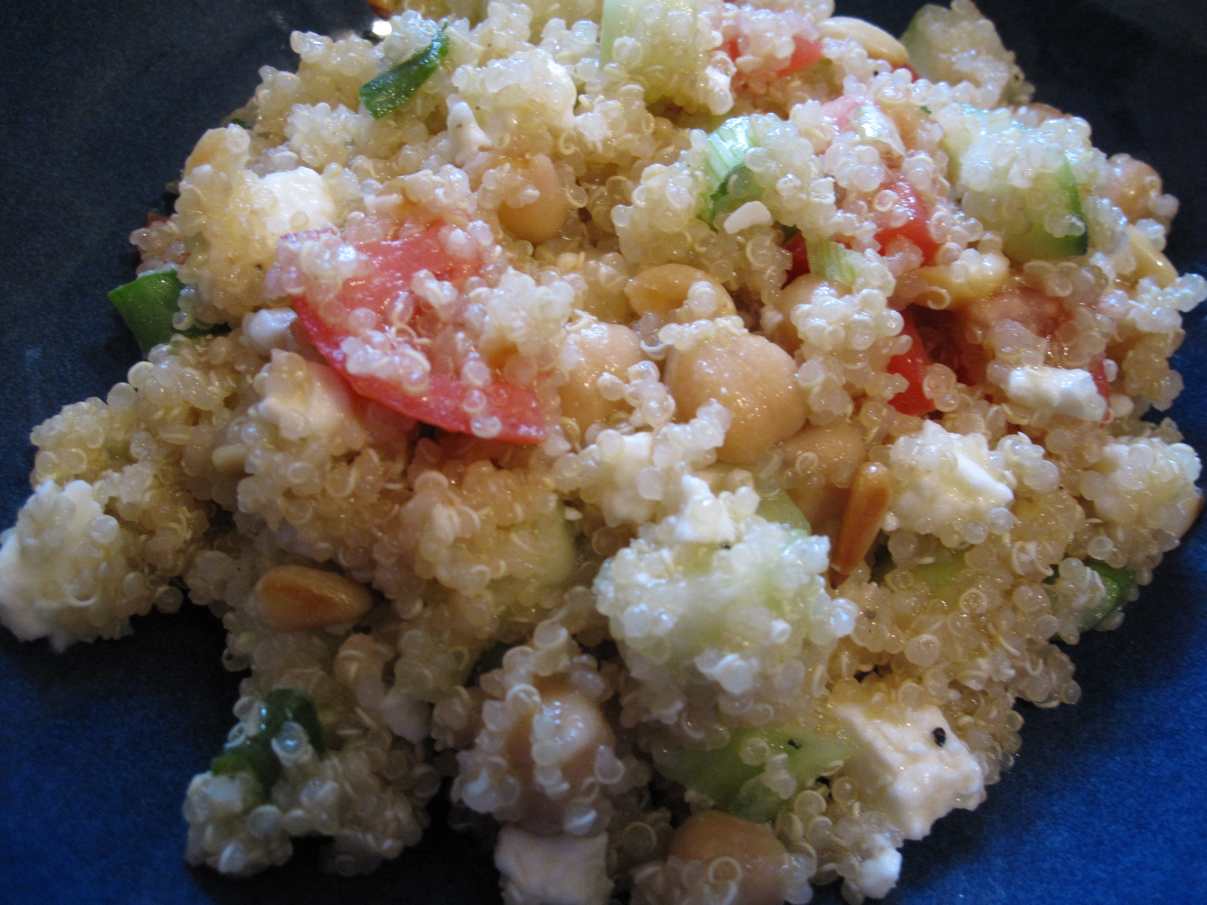 Alright it’s already February (how’d that happen?) and I planned to post this as a healthy new-years resulotion-type recipe. Oh well, better late than never! This is a nice, light and healthy recipe inspired by a Mediterranean cous-cous recipe my mom used to make. I started making it back in college and people seemed to really love it. I used some of the same ingredients in this recipe and swapped quinoa for cous-cous for added nutrional benefits. I also added chickpeas (because I’m obsessed) and omitted arugla, which I think I will keep next time for some added greenery. Greenery is a word right?