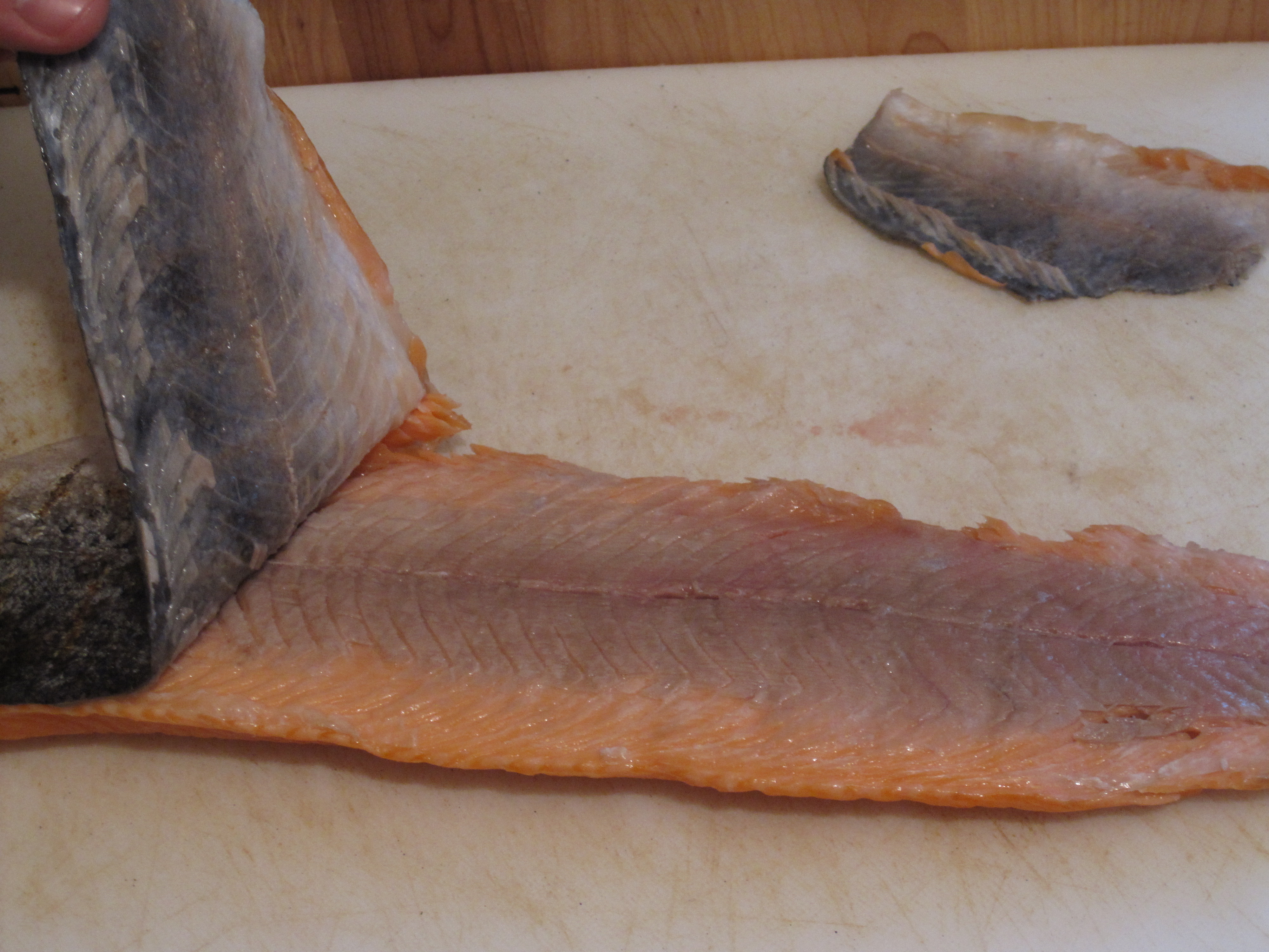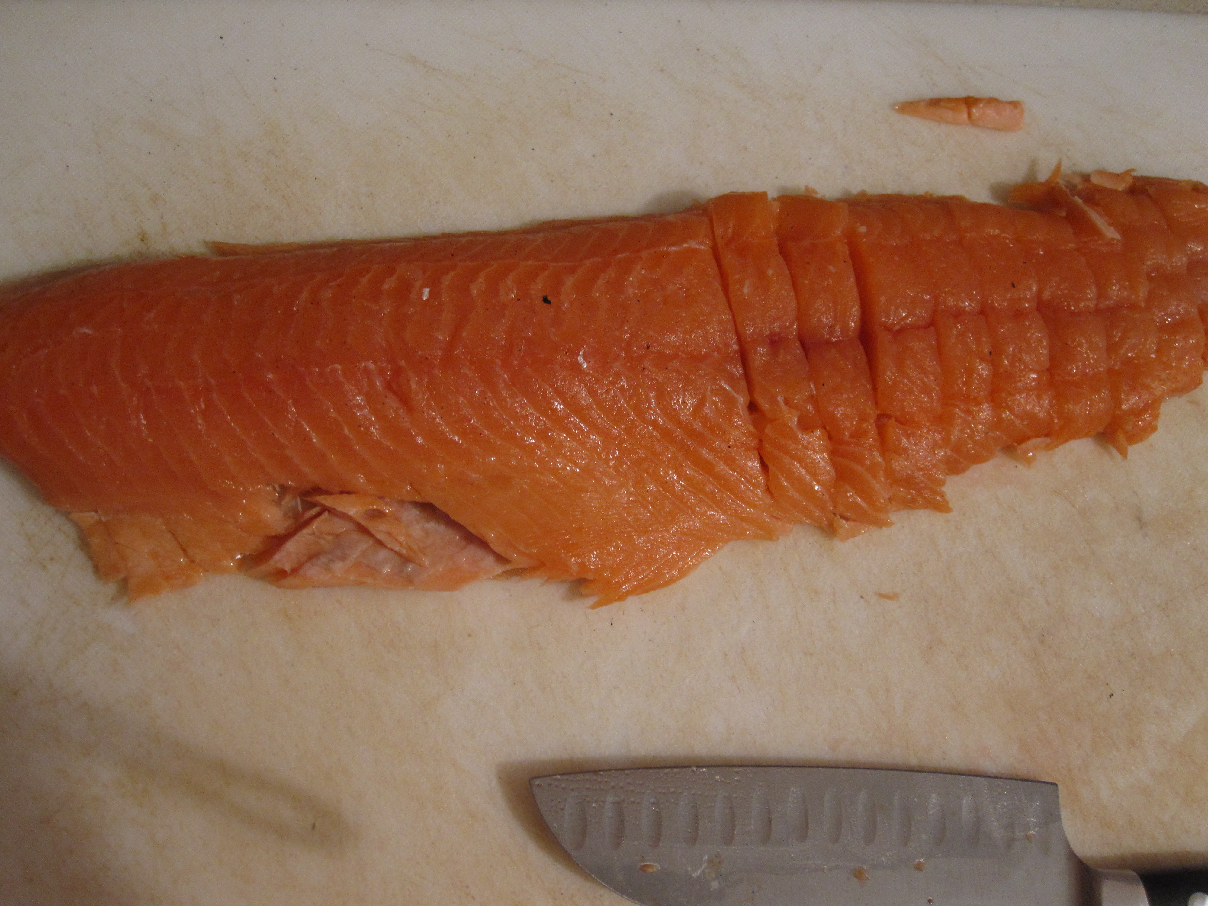 It started with this beauty of a piece of salmon. This was a little over a pound though this picture makes it look huge. Since the fish had skin on the bottom side and it is such a mess to try to take the flesh off of the skin when it is raw, I had this ingenious idea! I got the grill really hot then put the fish skin side down, turned the flame off, and closed the lid for just 2-3 minutes. This was just enough to cook the skin so that it easily separated from the meat which could then be chopped up, basically raw to form the cakes.