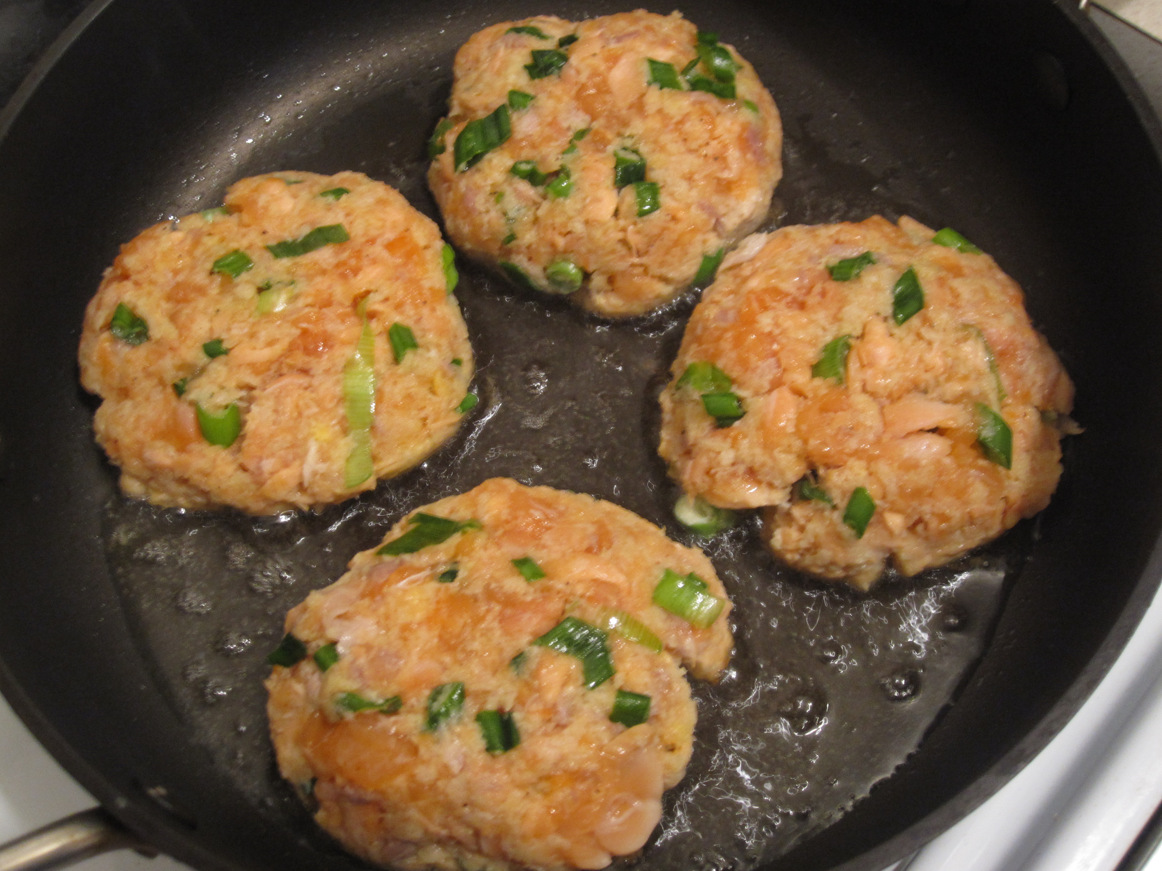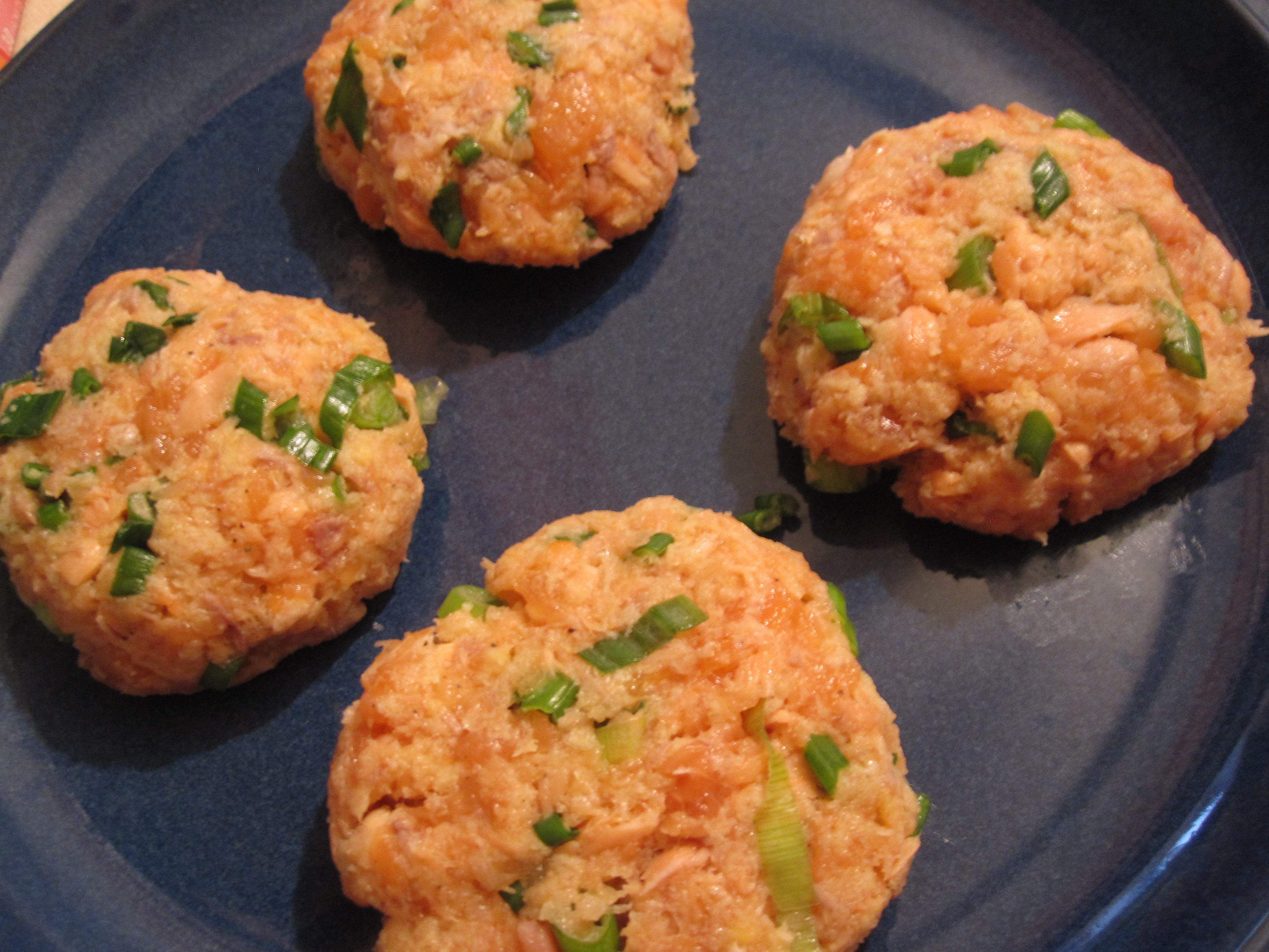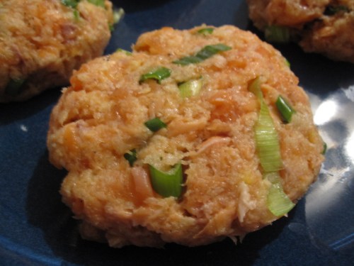 Sorry for the gap in posts. Bizzy! These are basically crab cakes (here is a Spicy Cilantro and Green Onion Crab Cake) with salmon instead. A similar consistency, fairly similar taste, and a little cheaper than crab most of the time. We had been having a lot of salmon because of a sale at Wholey’s and this was a good way to switch it up a bit and maximize the fish.