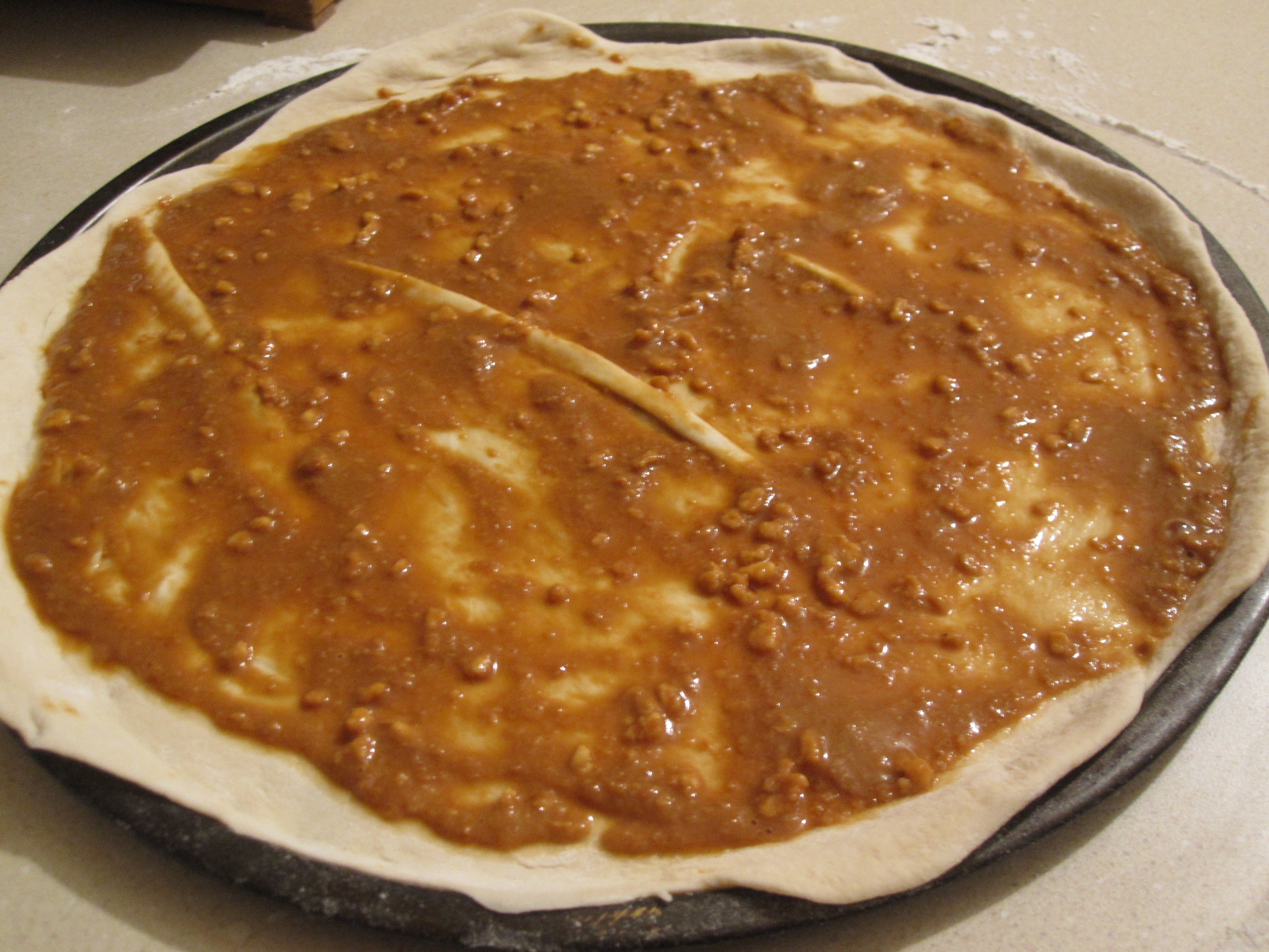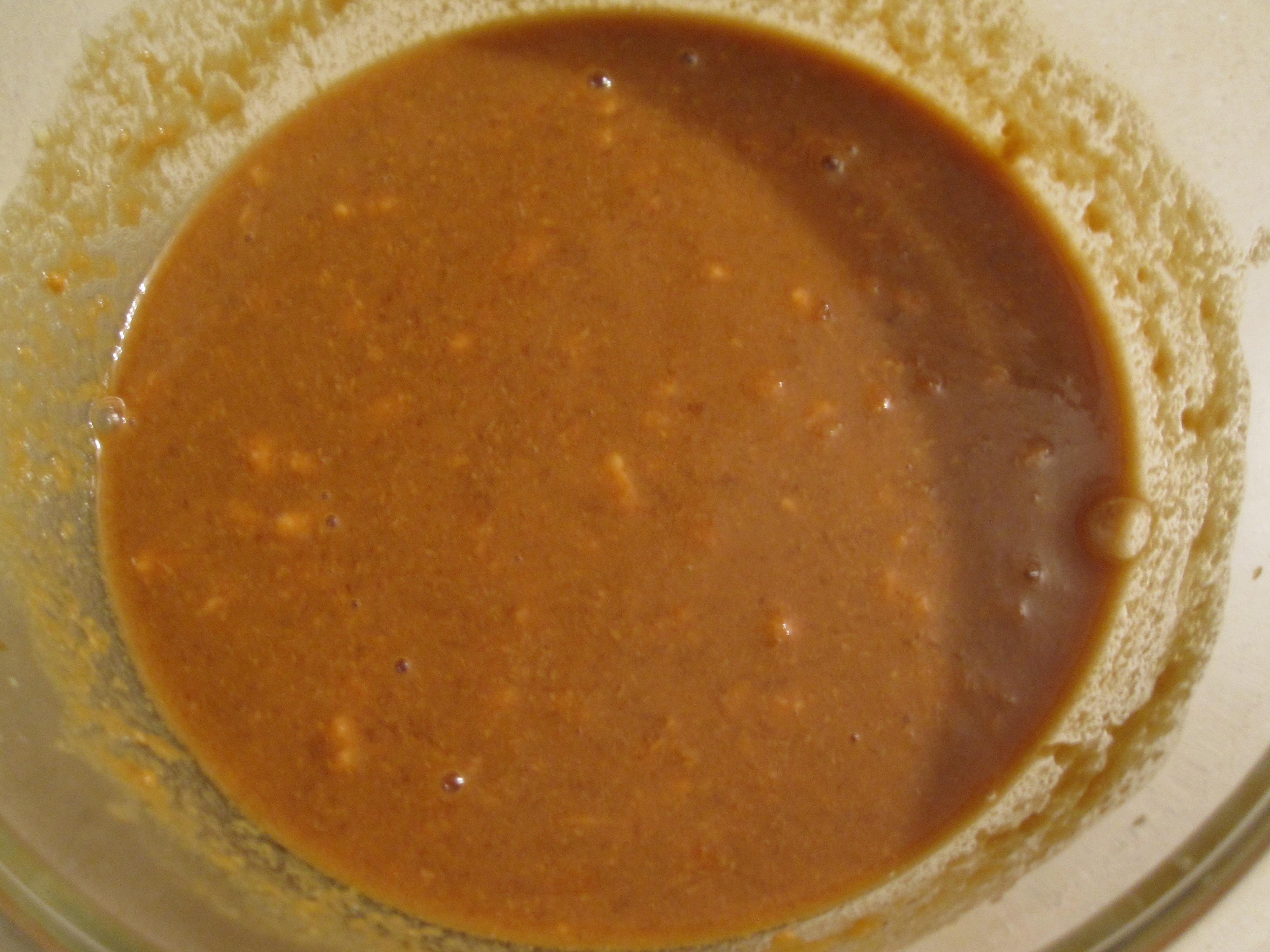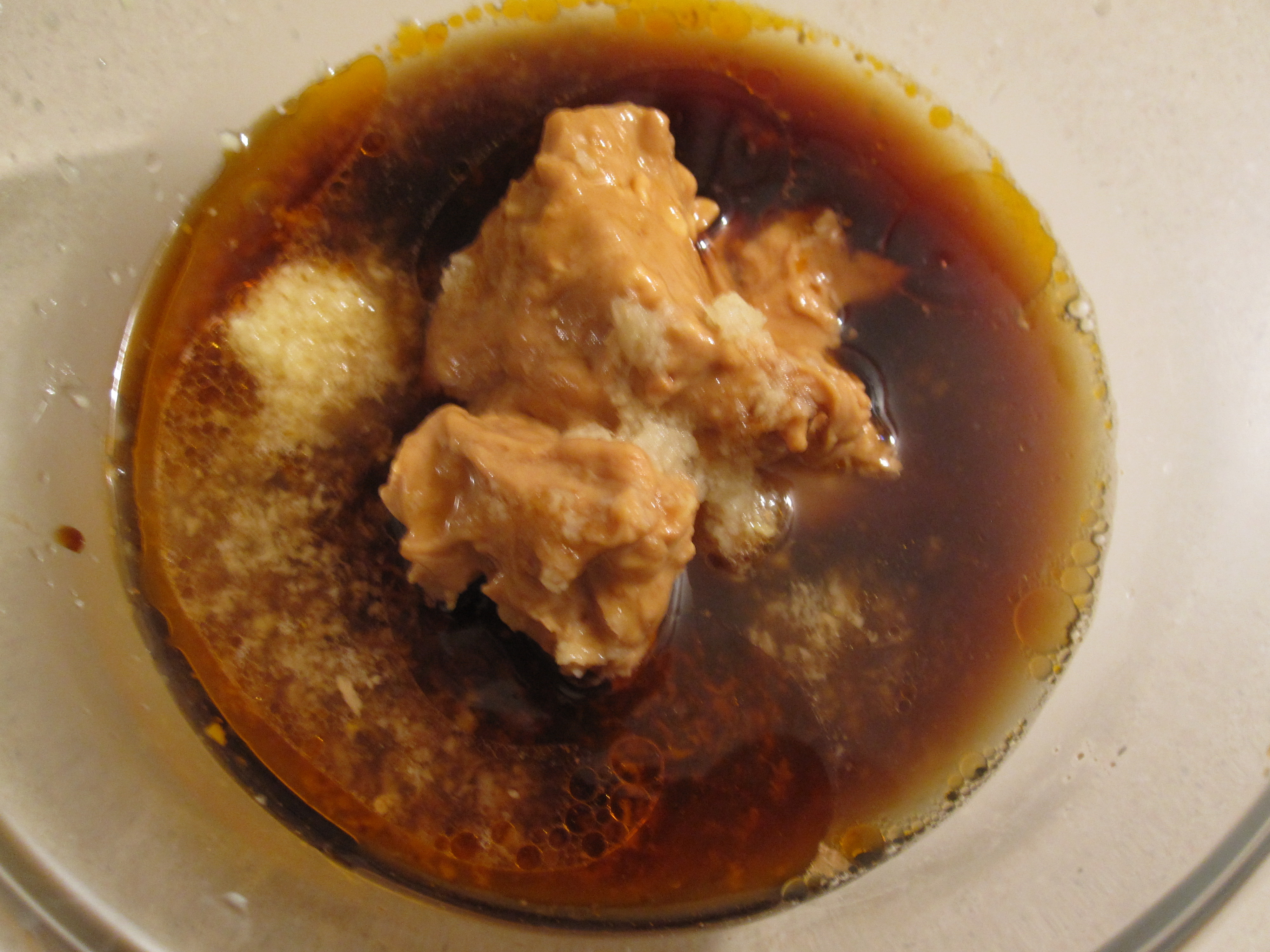 First, the peanut sauce. If you compare this pizza to a more traditional red sauce and cheese pizza, this is the red sauce. This is going to be the base of the pizza and give it great flavor. The sauce is a combination of peanut butter, brewed tea, rice vinegar, soy sauce, chili oil, grated ginger and honey.