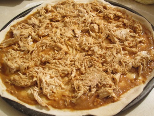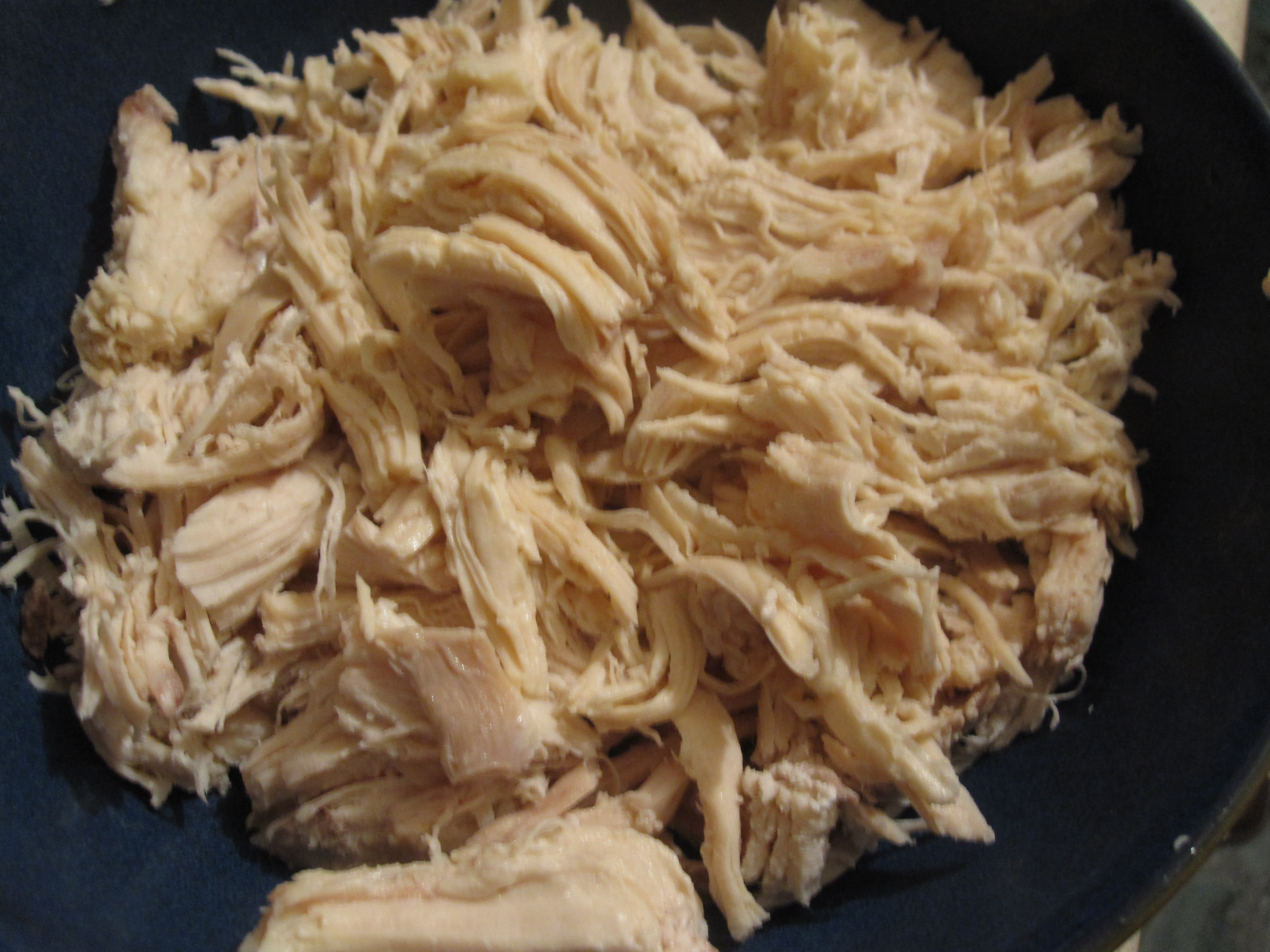 Once the chicken is shredded, add some of the peanut sauce to coat it. We also made the dough according to this recipe and it turned out great.