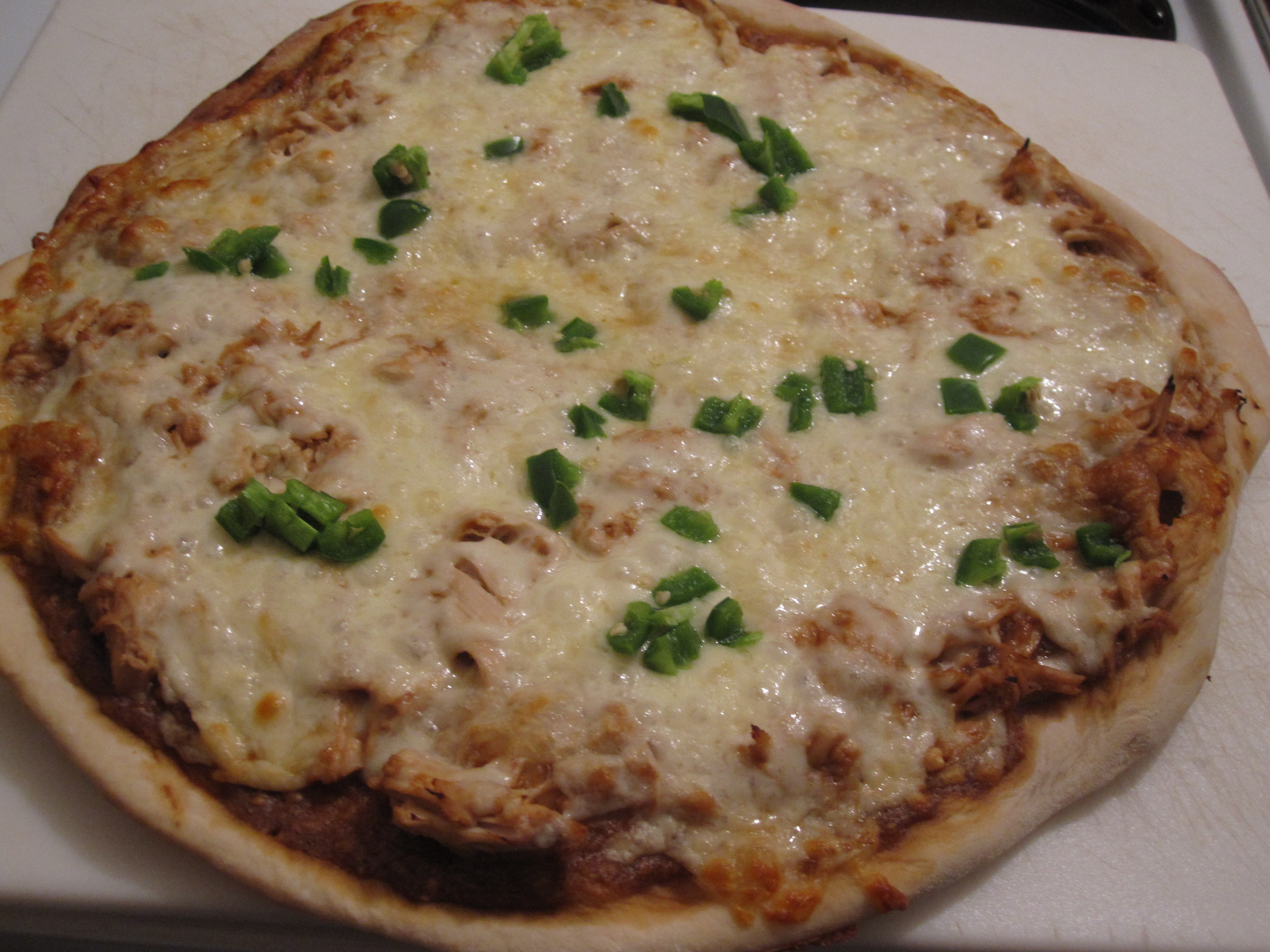 Bake at 425 degrees, for about 8-10 minutes. Keep an eye on it! You are looking for a nice golden brown crust and for the cheese to be bubbling. (Greg also threw on some jalapenos)