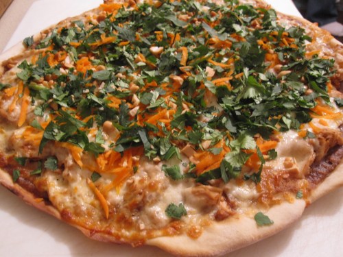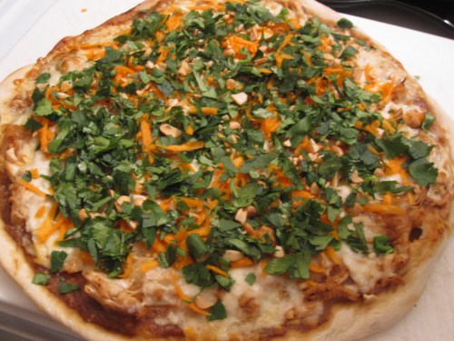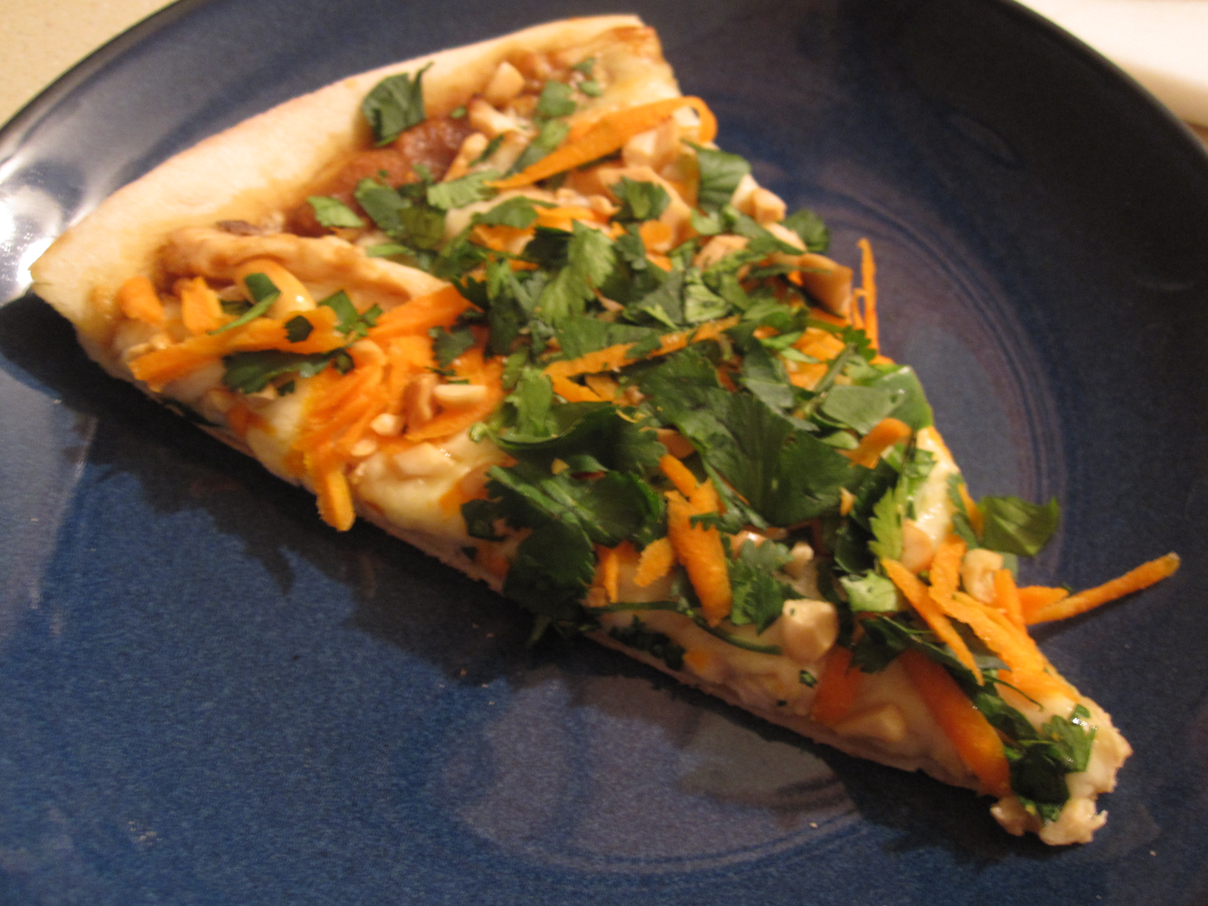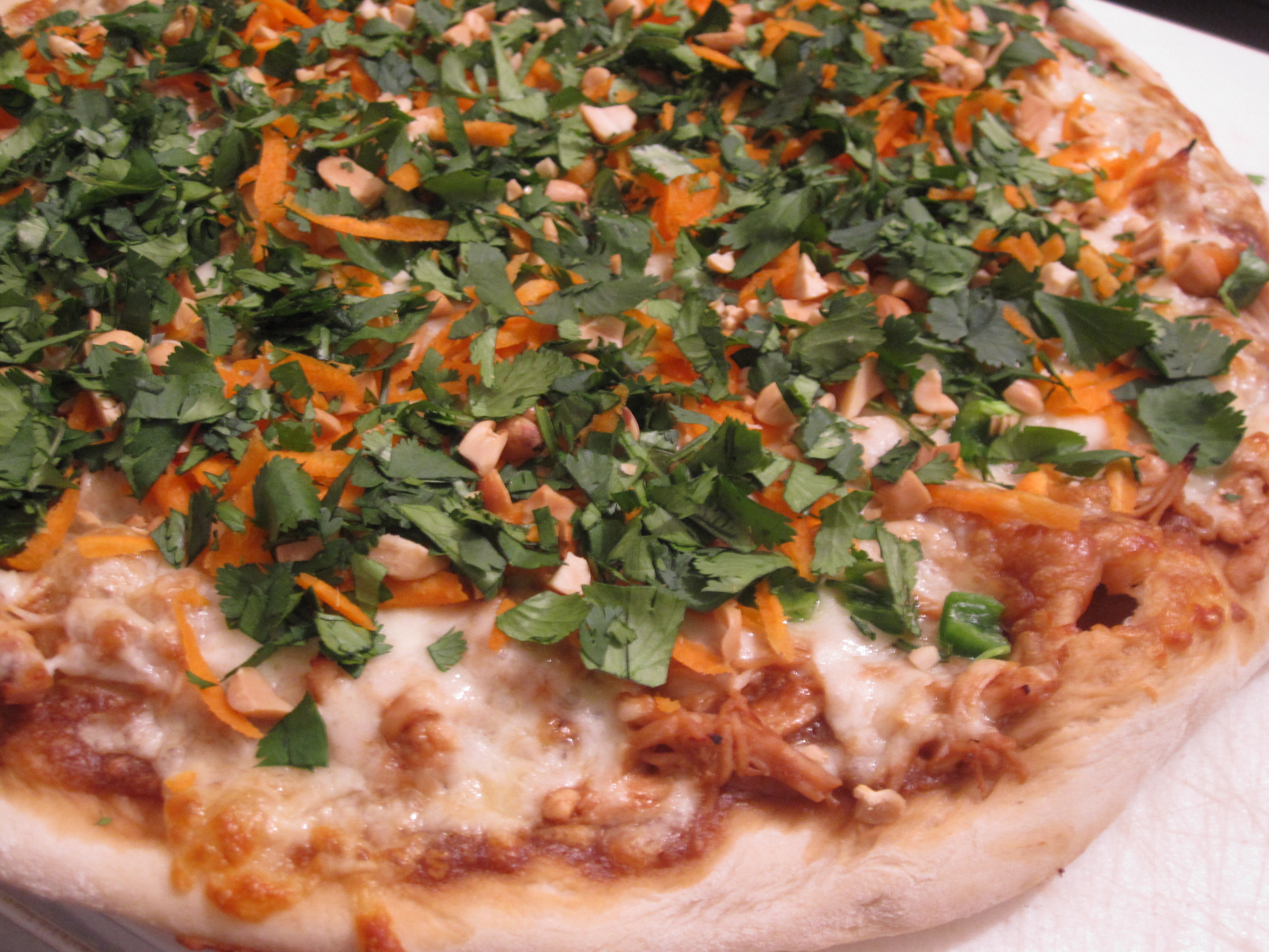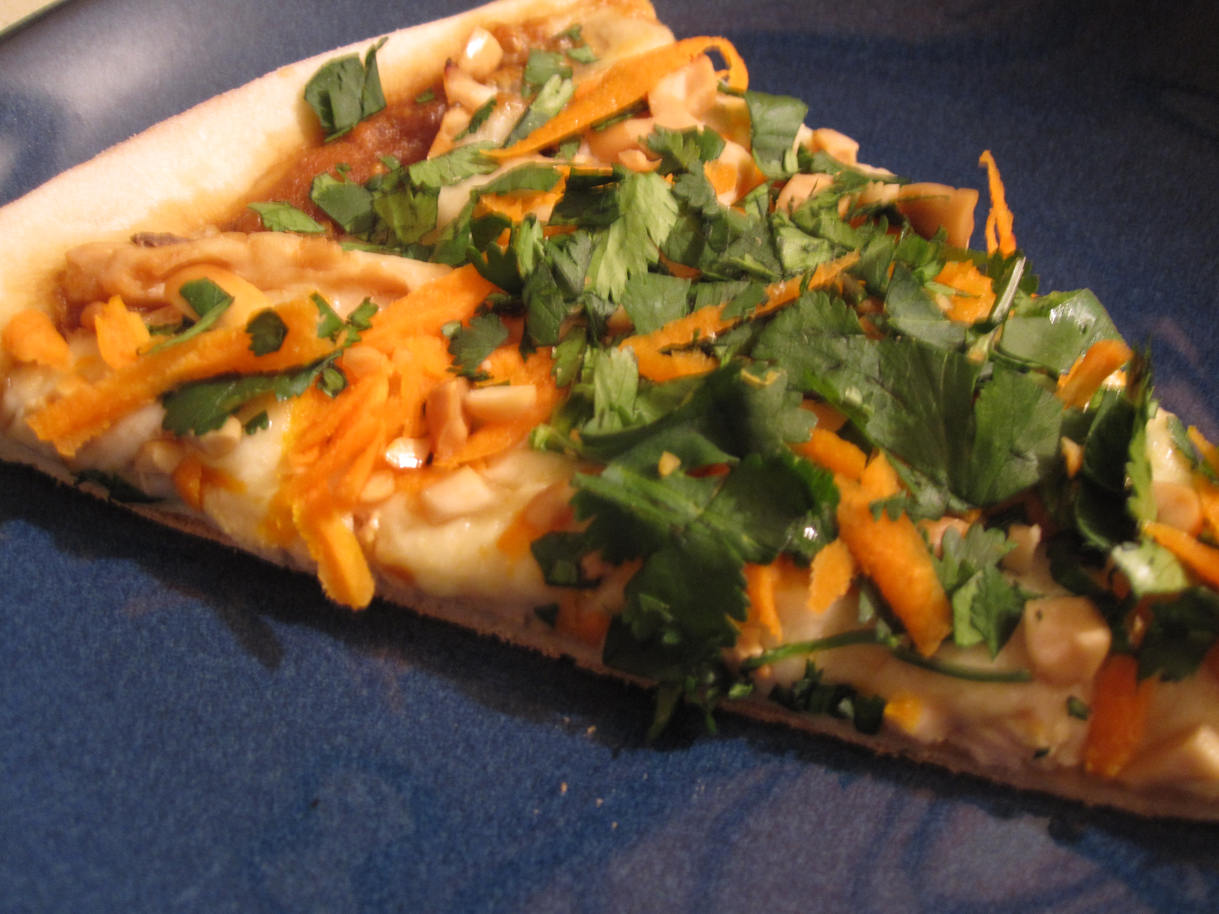 Top the pizza with grated carrot, cilantro and chopped peanuts.