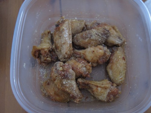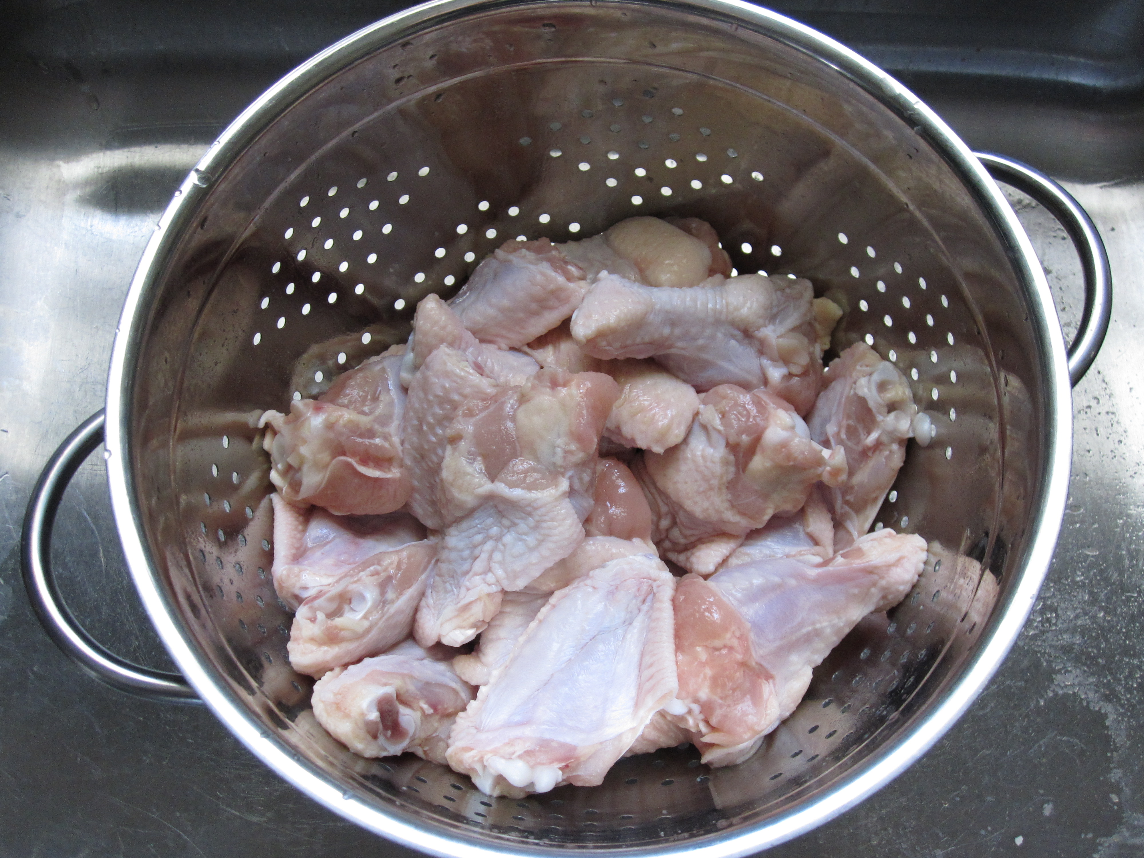 The first question is whether to use fresh or frozen wings. There are arguments for both of course, but we have found that either will be just fine and to get whatever is on sale or the cheaper one. With the frozen ones the most important thing is to make sure the wings are completely thawed. With the fresh wings, you may have to cut off the wing tips, which is not for the faint of heart. Either way you go, the first step is to rinse the wings well and make sure they are dry. If there is any moisture on them, it will pop in the oil and splatter.