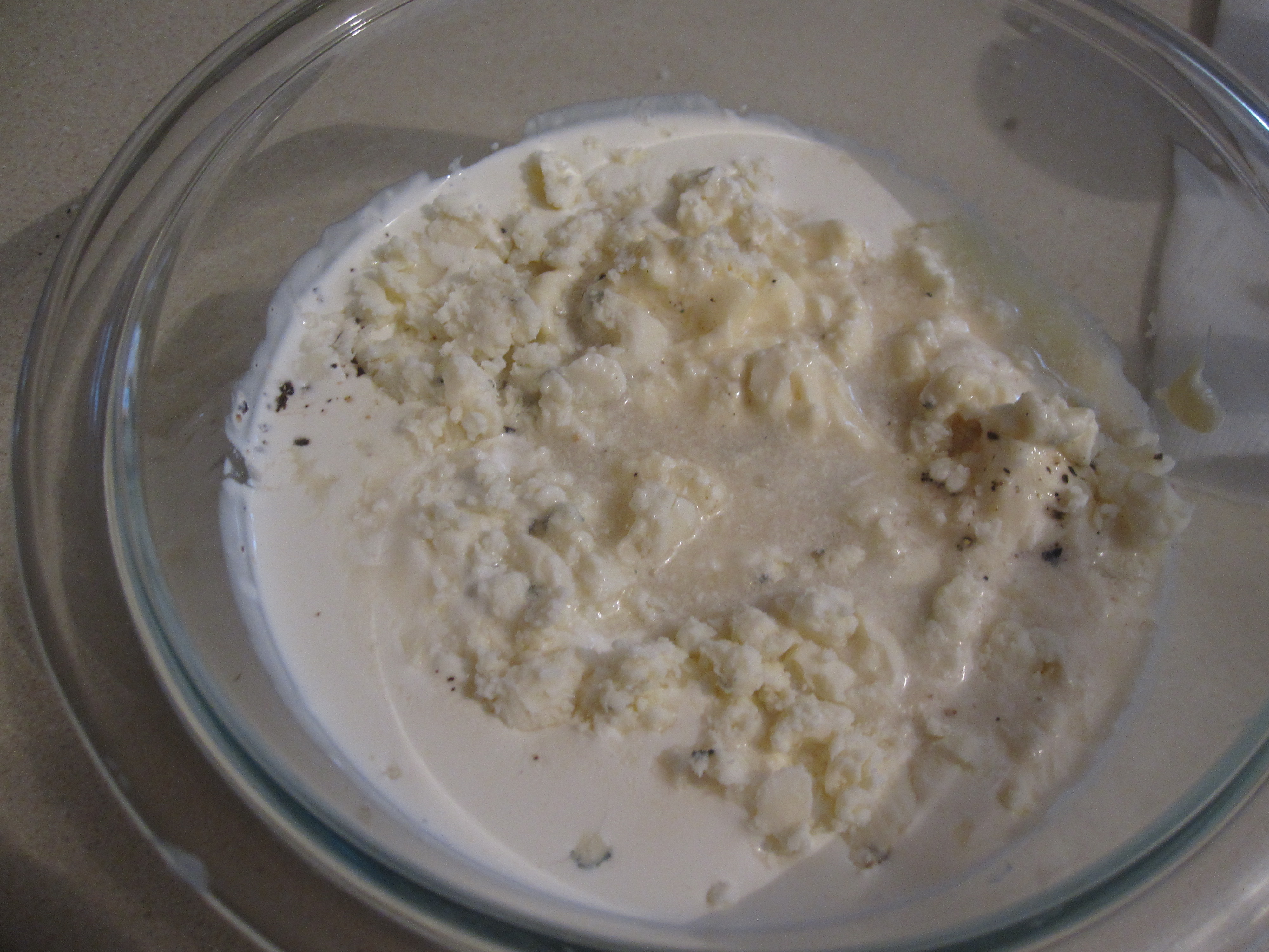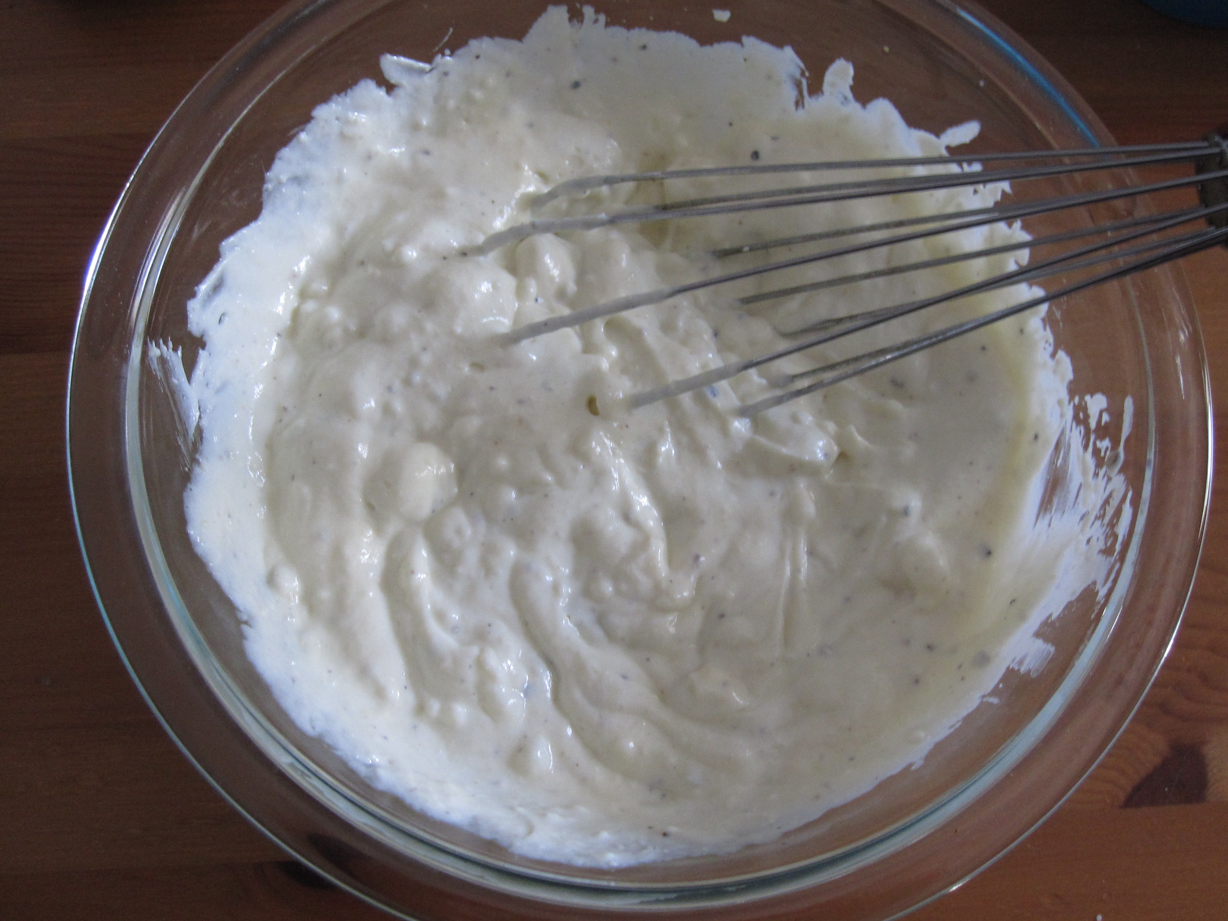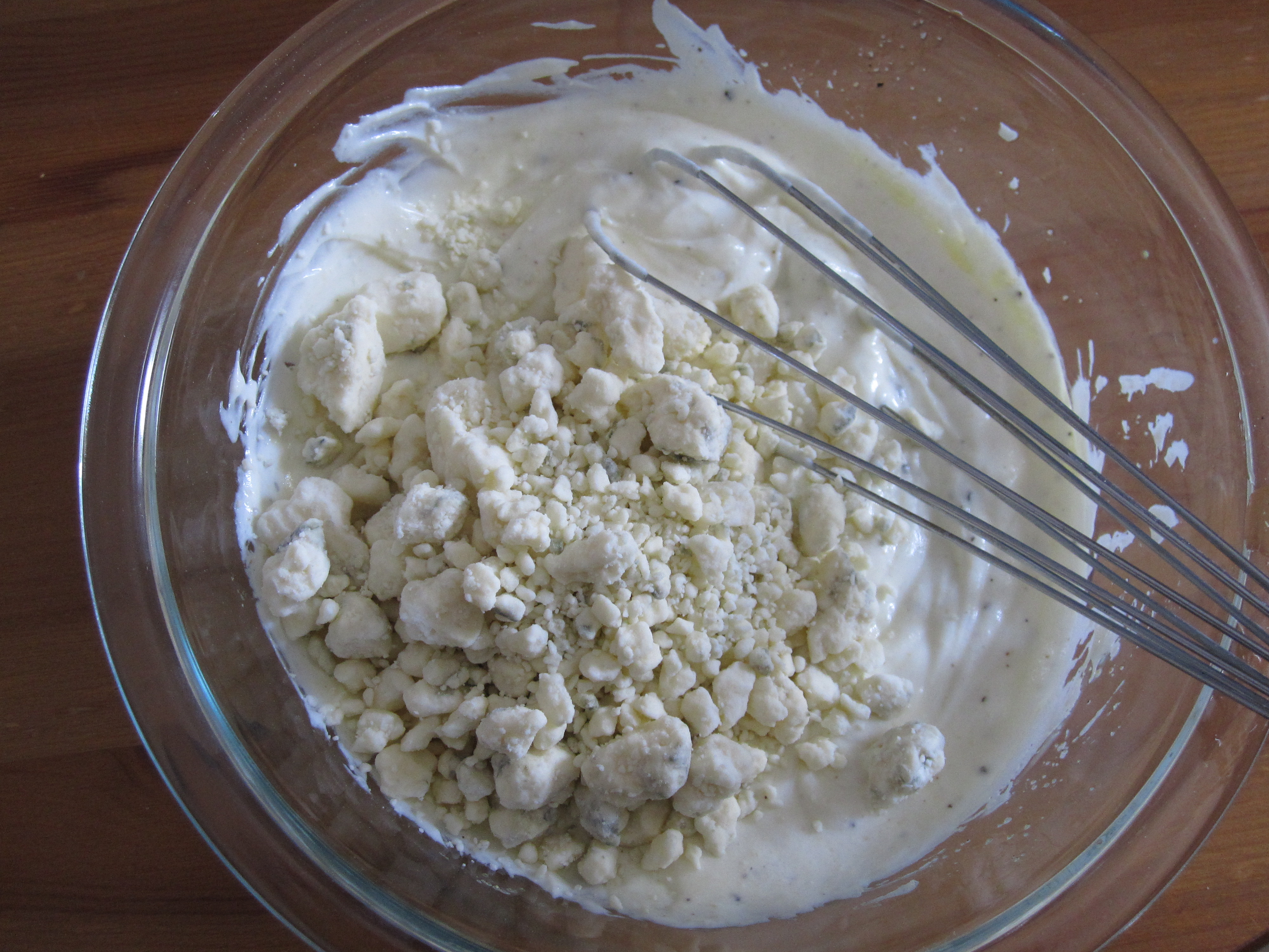 The next step is to make the dressing. Greg got this blue cheese down the strip.