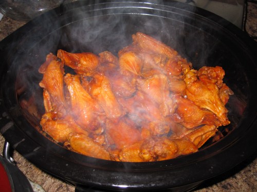 for transport and to keep them warm, we put the cooked and sauced up wings into a crock pot