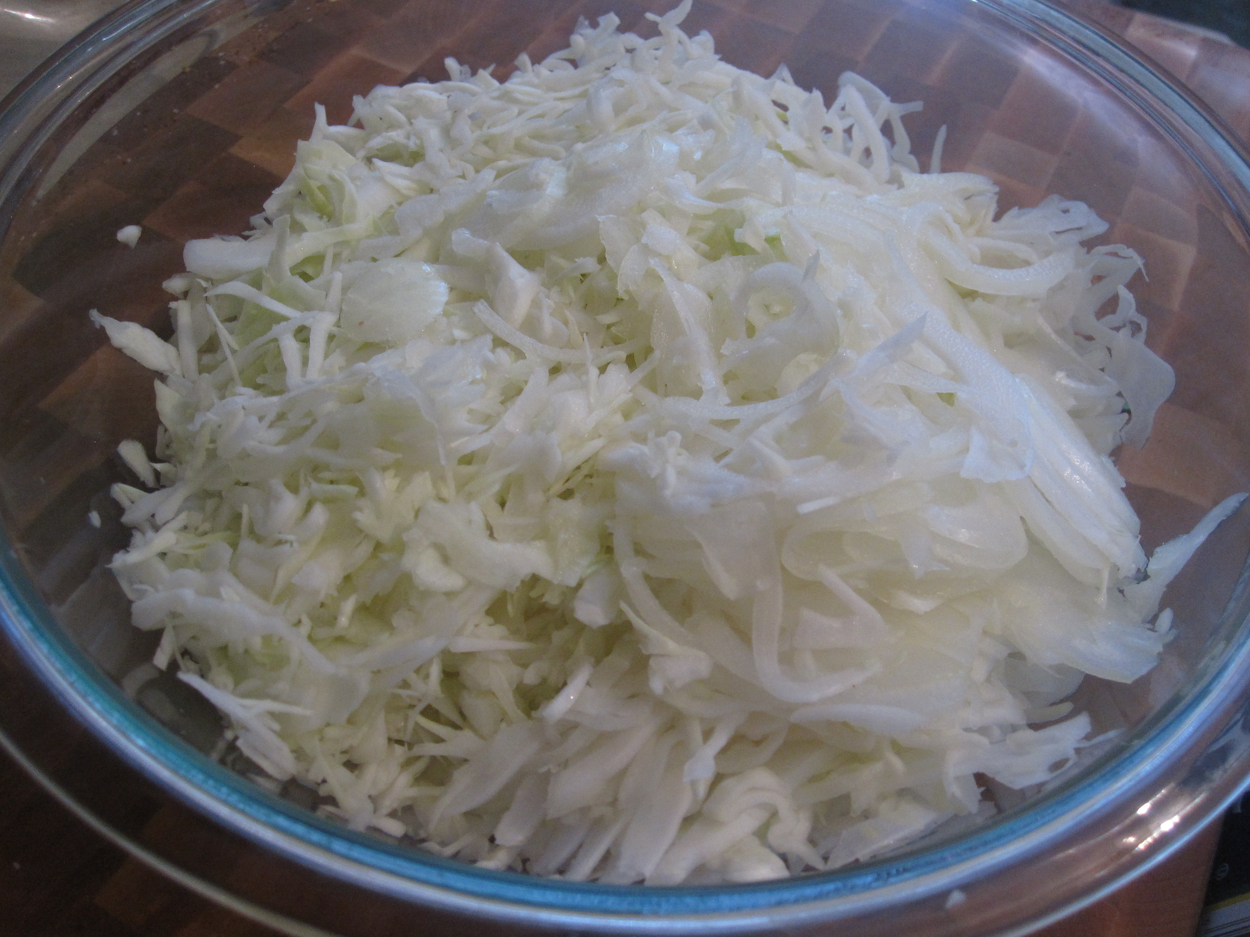 First, I shredded some cabbage and a yellow onion in the food processor. You can also buy a pre cut bag of slaw mix or add some red cabbage or carrots for some more color if you’d like.