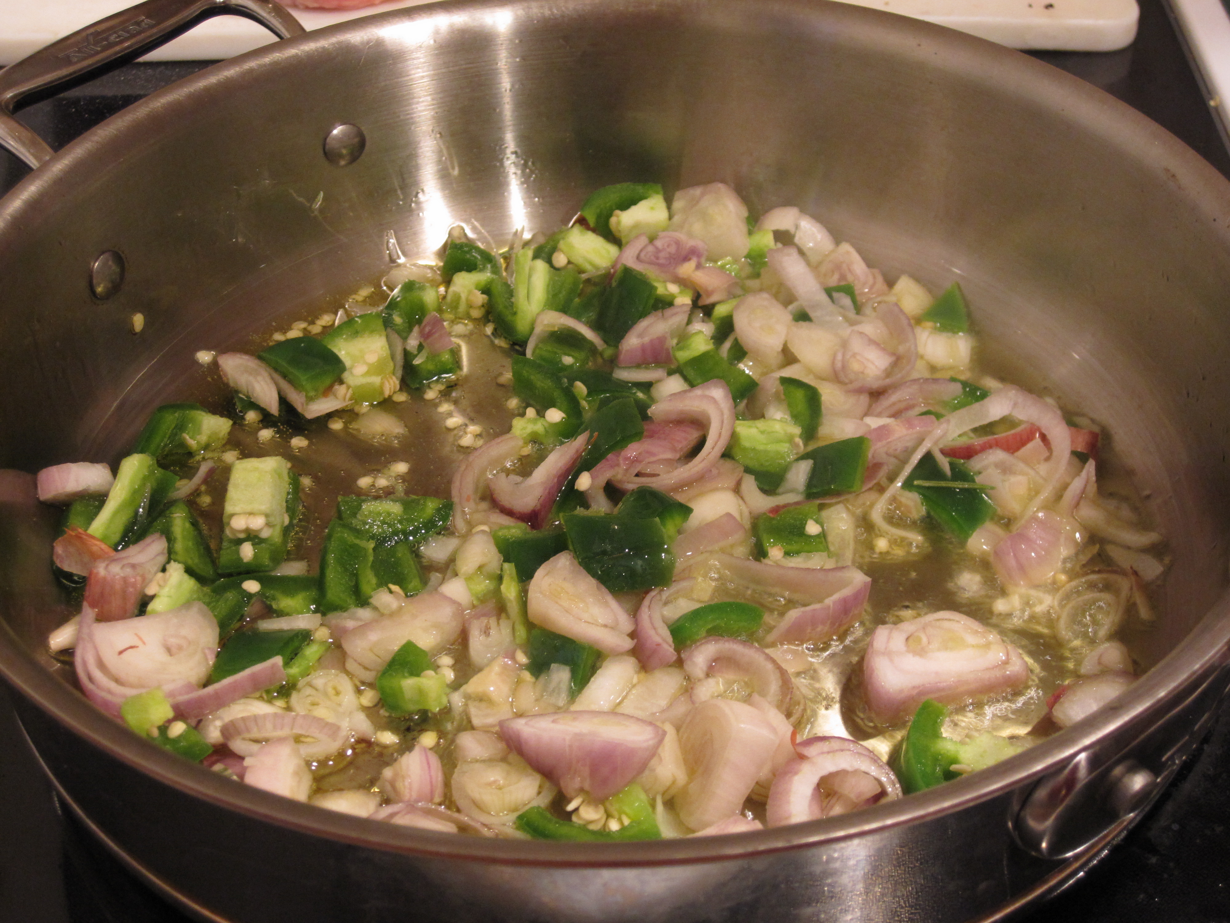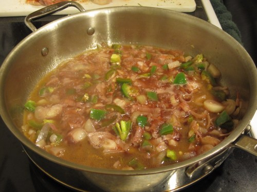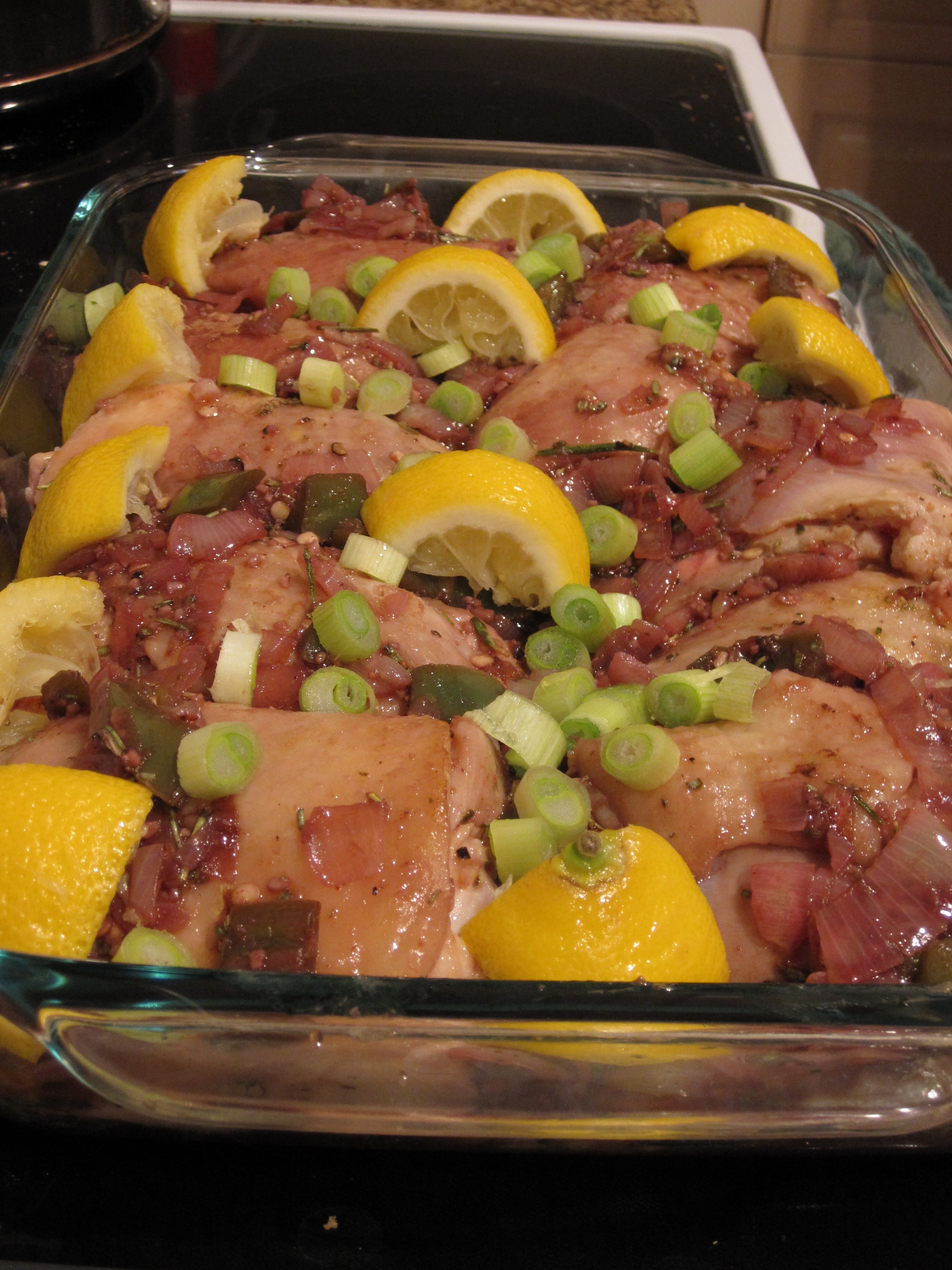 We bought a nice big tray of chicken thighs from Giant. These did have bones and skin on them, both which keep in a lot of flavor and natural juices. We started off by making a braising liquid, using the shallots, jalapenos, lemon and wine (unfortunately we only had red wine, which is why the chicken is purple/red hue).