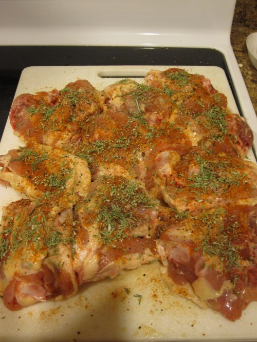 we seasoned the thighs and sprinkled them with some ground rosemary (I used the bullet for this).