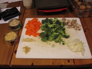 On the cutting board: carrots, broccoli, mushrooms, onion, ginger, and garlic. To the left of the cutting board: water chestnuts and bamboo shoots.