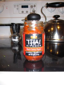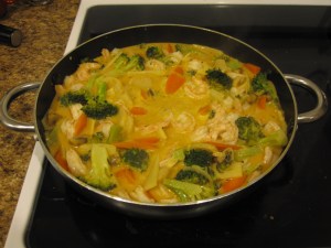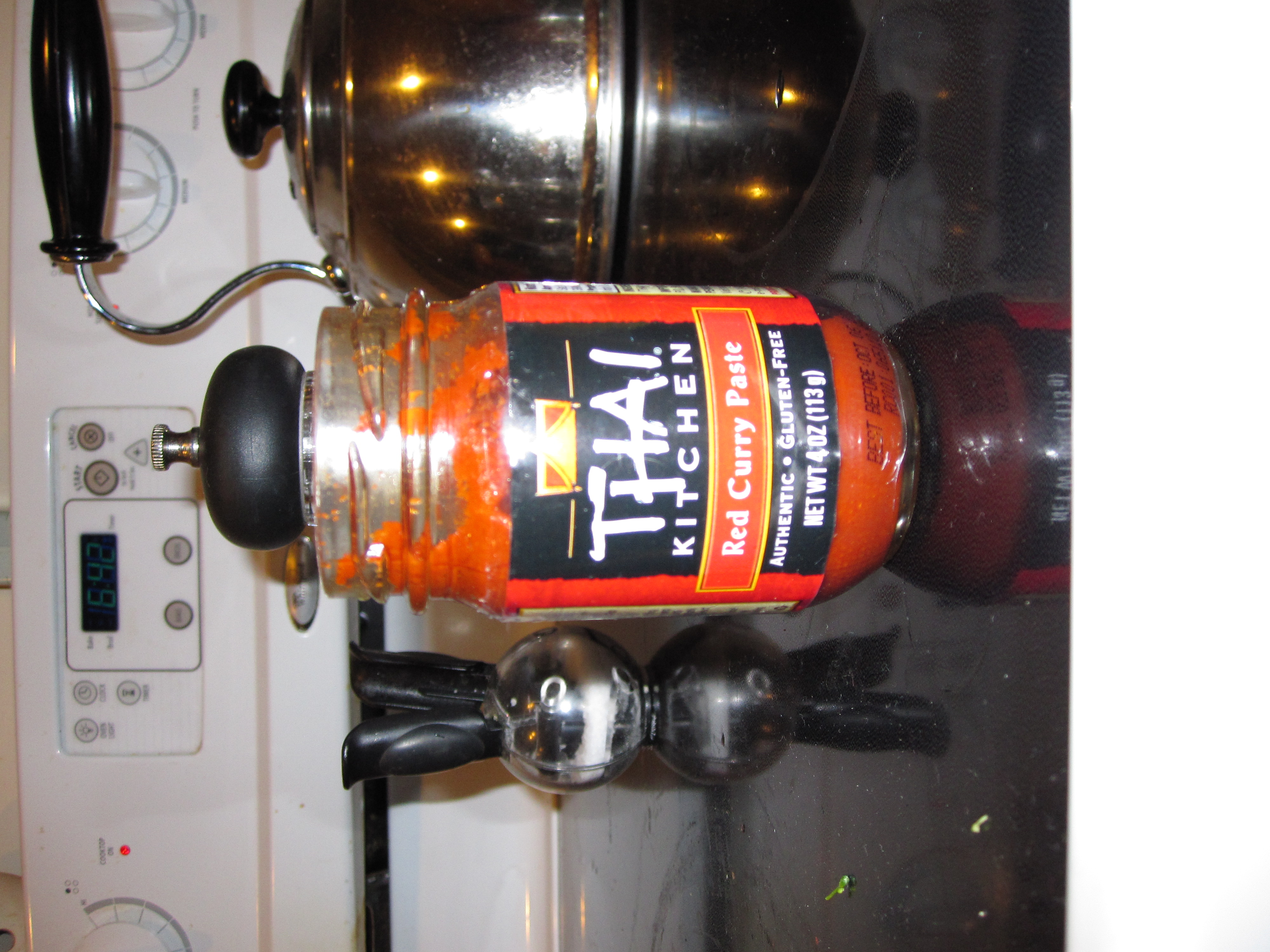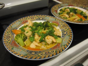 Wahoo! A day off! It’s always great to have Monday off. First you get a long weekend and then you face a short work week when you get back on Tuesday. It’s also really nice when on the day you have off it is almost 60 degrees outside! I got in a nice long run, did some pilates, and then hit the supermarket for tonight’s dinner: Red Coconut Curry with Shrimp and Vegetables. I was actually the visionary behind this one, but got some assistance from Greg because he is an excellent shrimp cooker. I also have to give credit to Thai Kitchen for creating and selling this curry paste. This took a lot of the trickery out of creating our own curry, which we lack the skills, knowledge and time for.