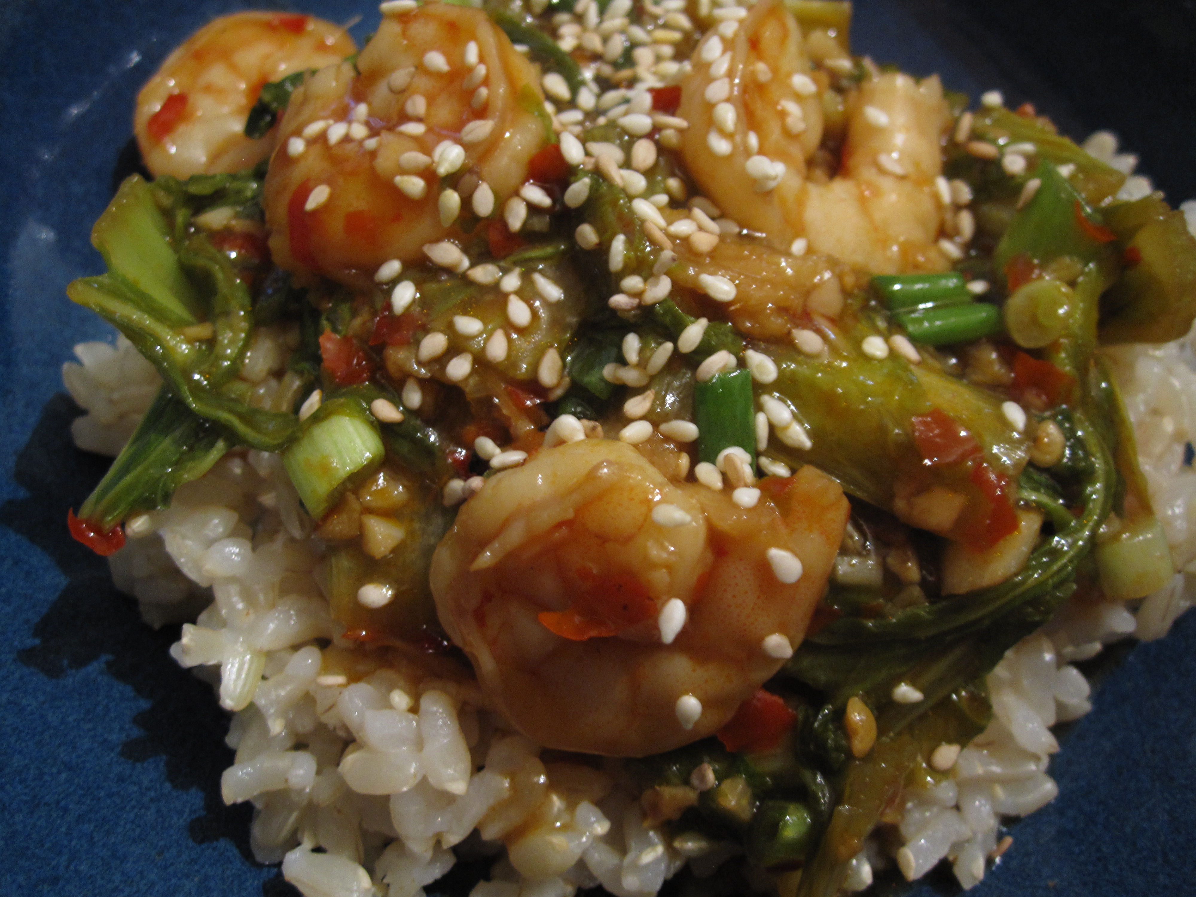It was close to done at this point.  Fish sauce and beef broth were added and allowed to simmer and thicken for a few minutes.  It was served over brown rice that was cooked in a half and half mixture of water and beef broth.