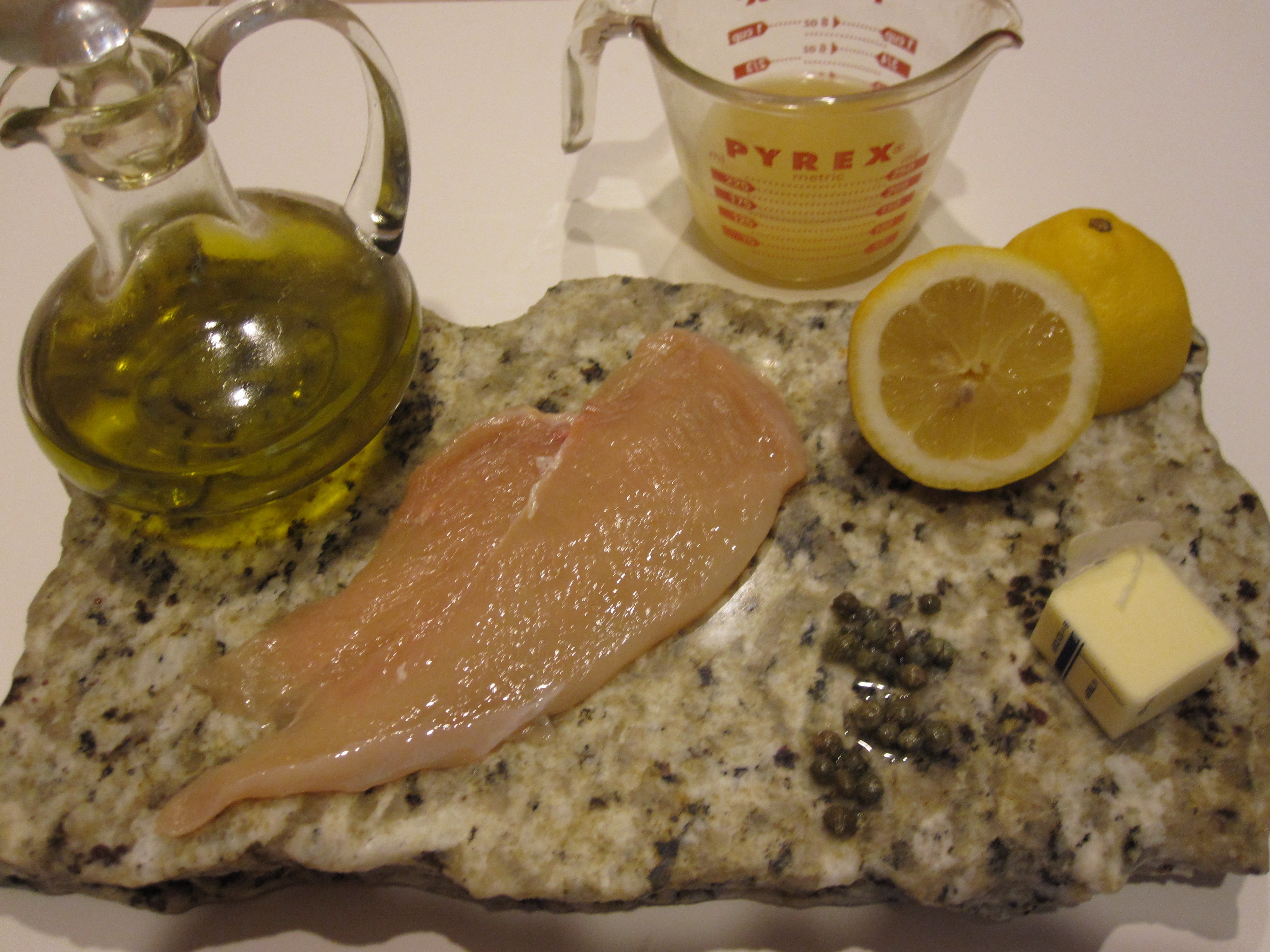 The ingredients include olive oil, chicken (of course), chicken stock, lemon juice, butter, capers and flour ( not pictured). I actually experimented a bit and substituted almond flour for traditional all-purpose flour. Almond flour/meal has more fiber and less carbohydrates than regular flour and worked pretty well in this dish.