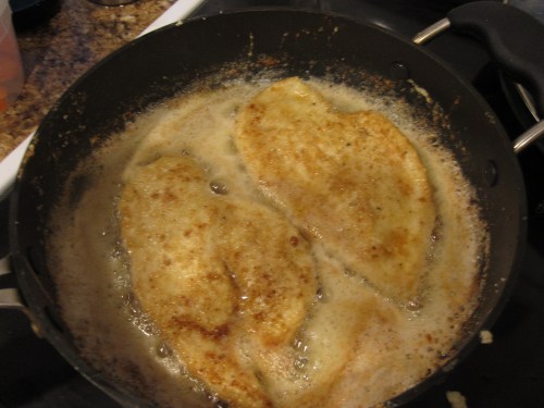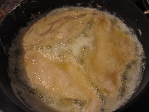 Then get your butter and olive oil going in a pan and begin to cook the chicken. Since the pieces are pretty thin they do not need much time, maybe 2-3 minutes per side.