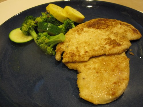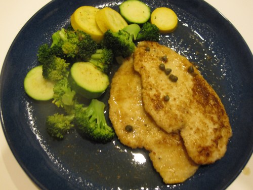 My sister sent me this recipe for chicken piccata almost two years ago and  Greg and I been loving it ever since. It ‘s certainly a basic version, but it’s  a nice easy to follow recipe and tastes great. I’ve served it with different sides in the past, including pasta, rice and veggies. Rice is probably the best as it soaks up the delicious lemony sauce. For this go round however I served the chicken with some steamed broccoli (another good sauce absorber),  squash and zucchini.
