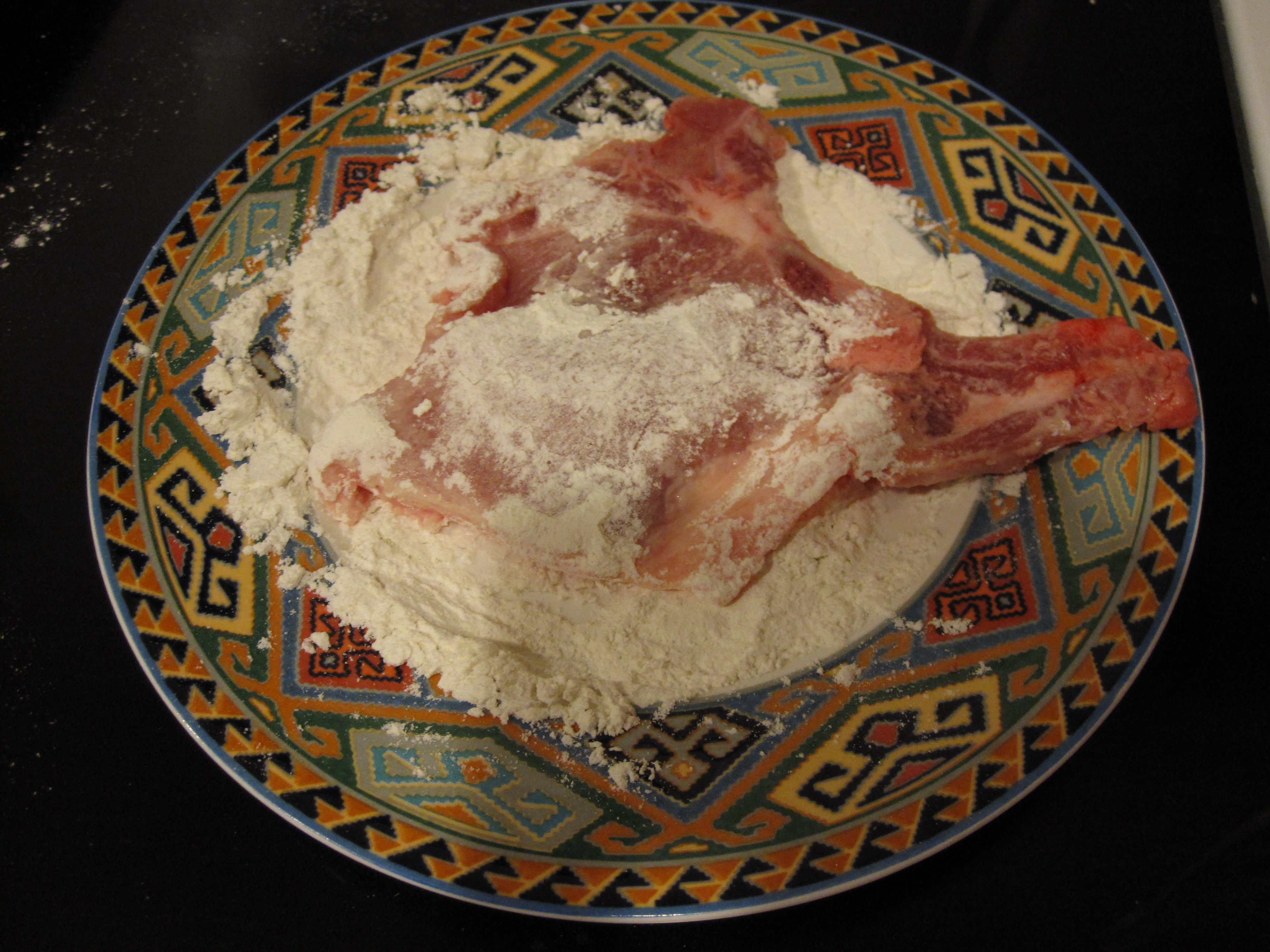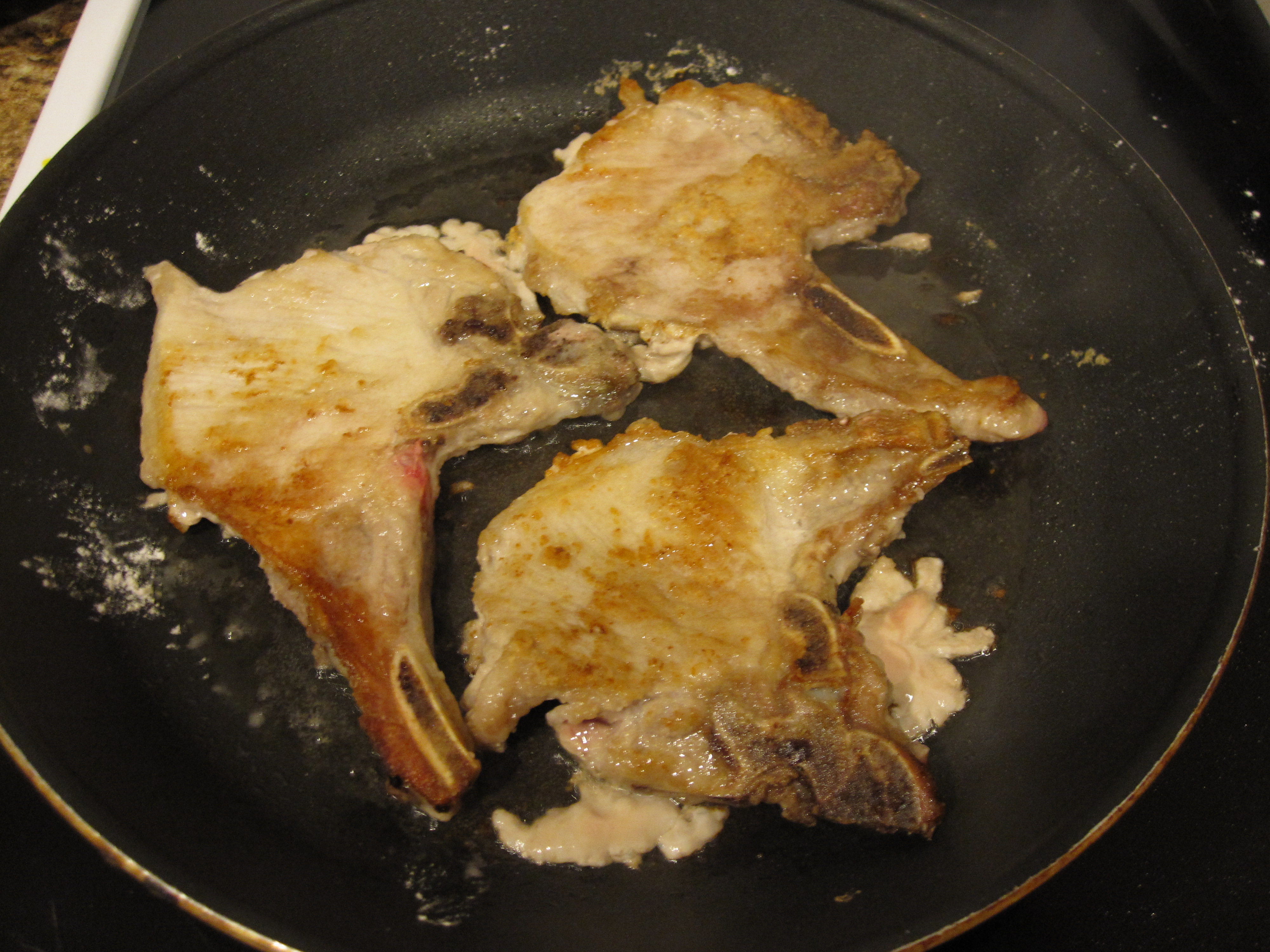 First, we dredged the pork chops in flour, a step that can be omitted if trying to go low-carb. I like to use bone-in pork chops for the extra flavor the bone provides. Don’t be scurred of the bones!