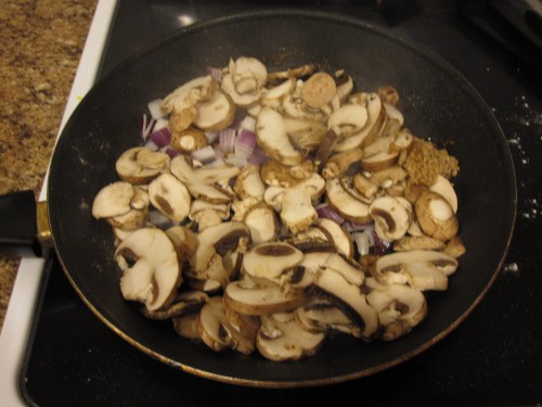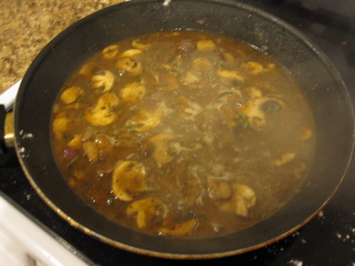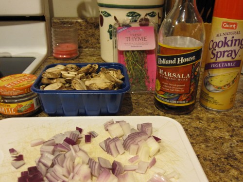 The sauce ingredients include mushrooms, onions, garlic, and Marsala wine to name a few. They actually sell Marsala wine at the grocery store, so no special trip to the wine store is needed (although if you are on your way there already they probably have it there as well!).  We also had some leftover thyme so we threw that in and it worked really well too.