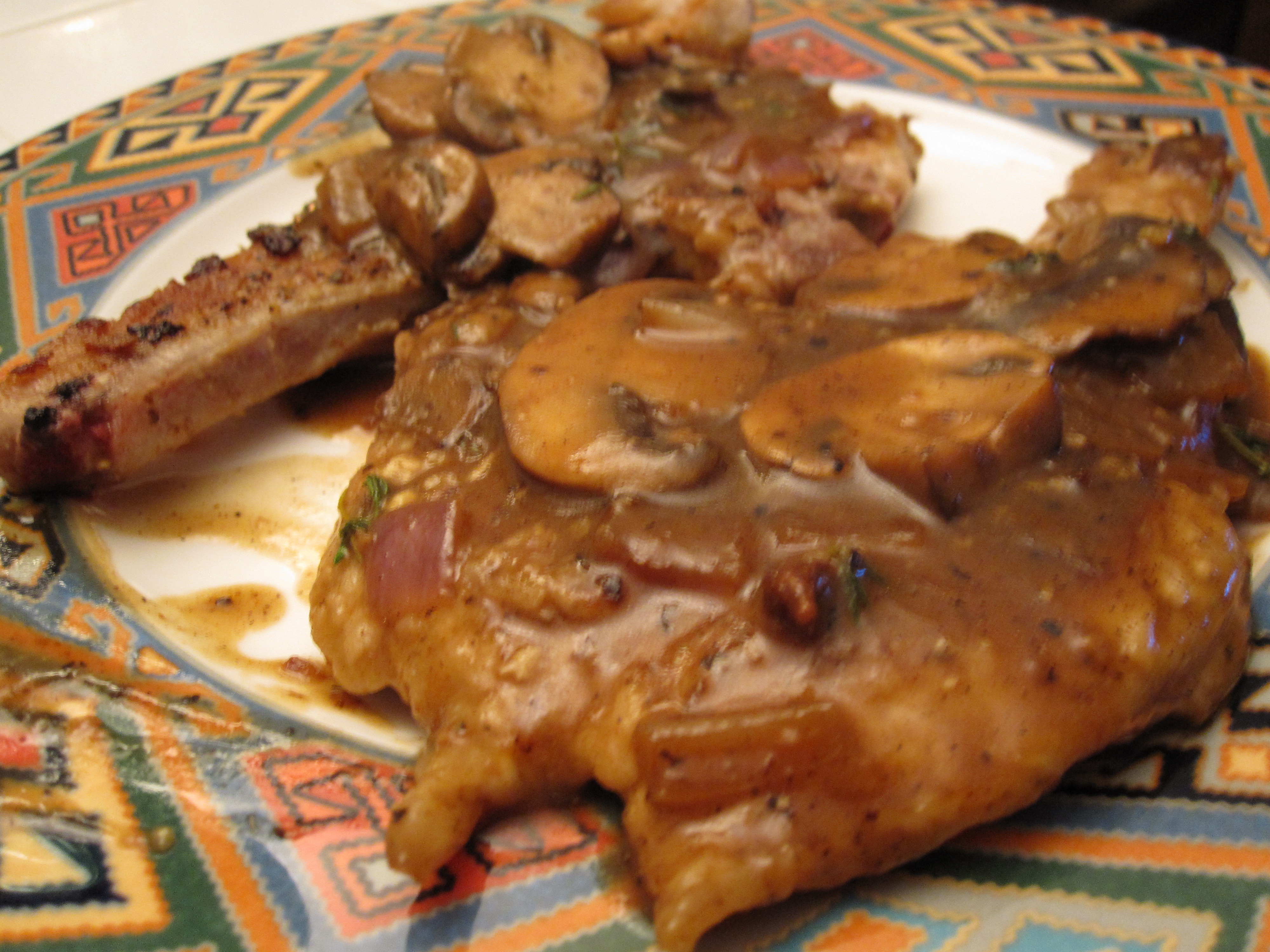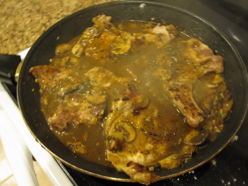 So for dinner we decided to make pork chops Marsala (a play on veal Marsala). This complimented the weather nicely, as the sauce came out thick and rich. Also, this recipe is relatively easy and doesn’t take too long to make.