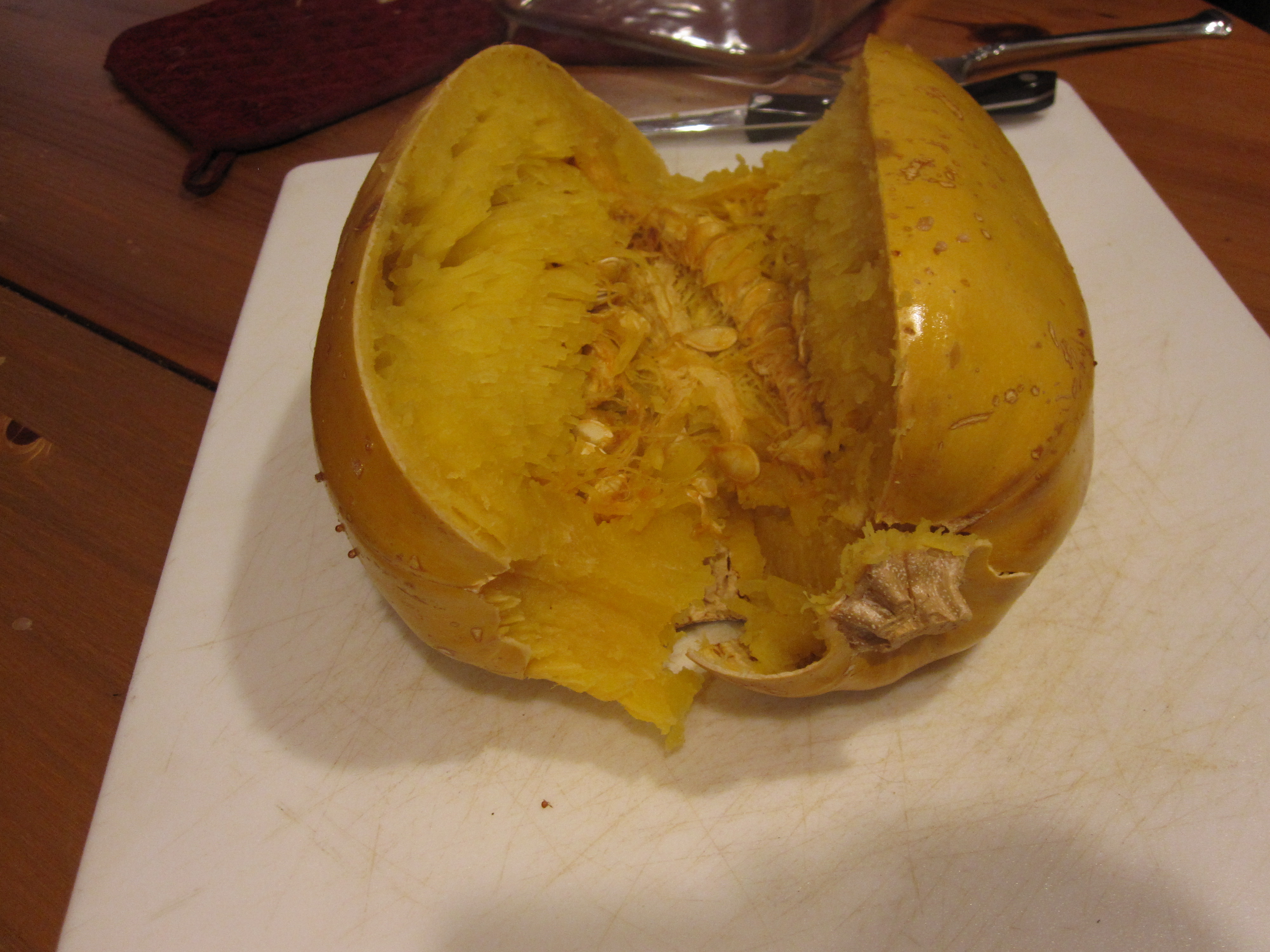 Conveniently, the directions for how to cook the squash are on the sticker. I microwaved it for about 12 minutes and then baked it for an hour in the oven.