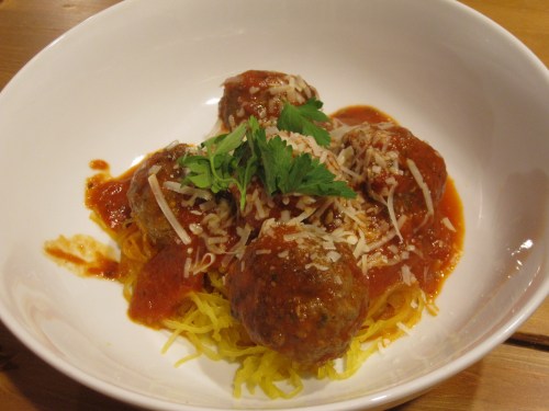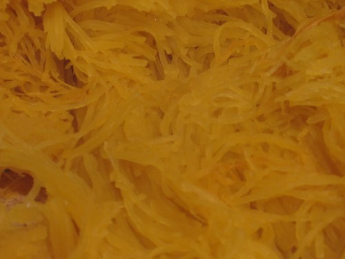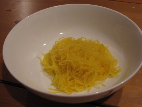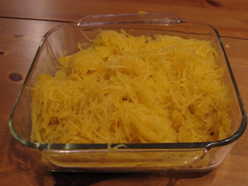 I have heard a lot about spaghetti squash throughout the winter on the many food blogs I read and I finally tried it a few weeks ago. I REALLY liked it and I found it to be a great alternative to pasta or rice, or really any starch you need to soak up some sauce. It’s almost like tofu in the sense that it has very little flavor of it’s own and conforms to whatever you want it to be. It is relatively easy to make and did I mention there are like 50 calories in the entire squash and very few carbs!