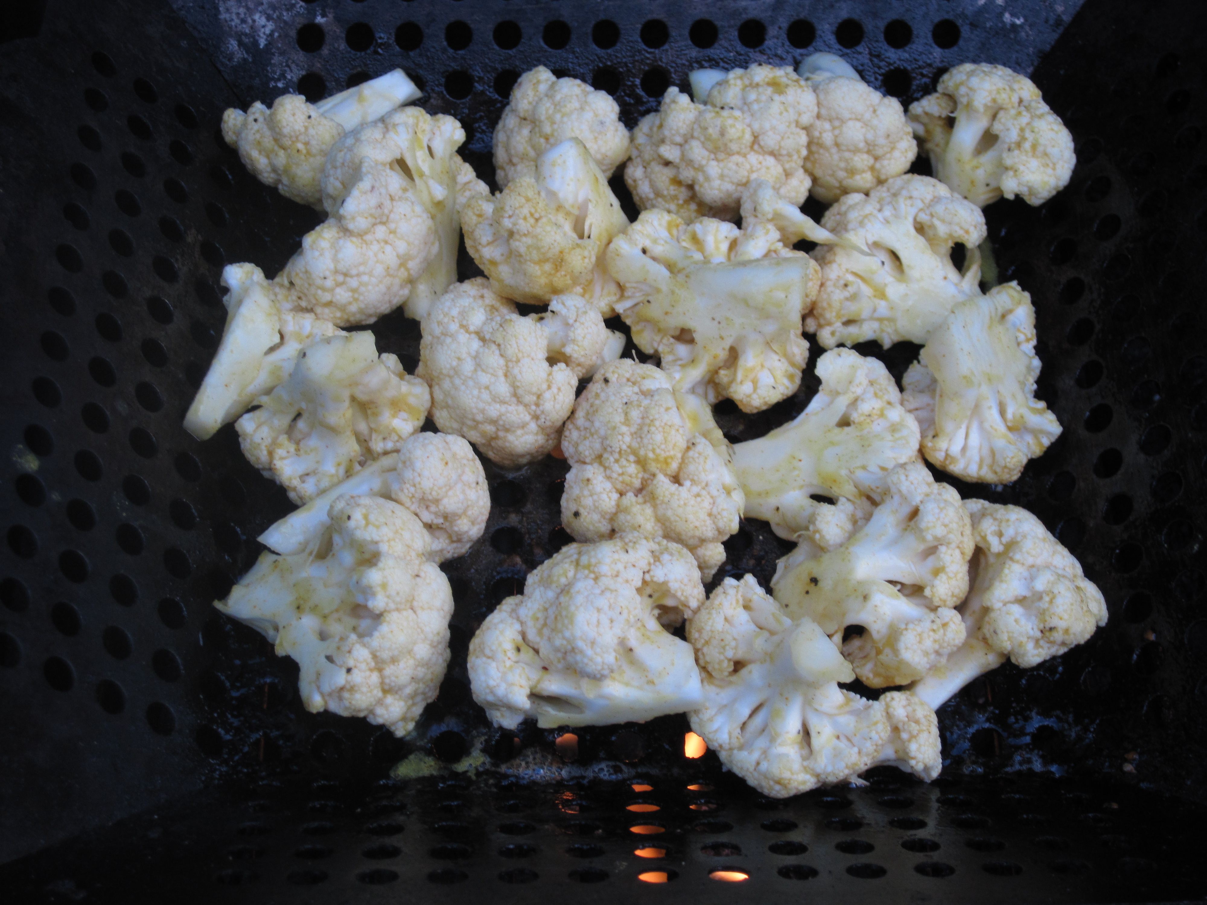 In the meantime, I cut up some cauliflower and covered it in vinegar and mustard before grilling.  I wanted something tart to contrast the pork and this easy mixture did that well.