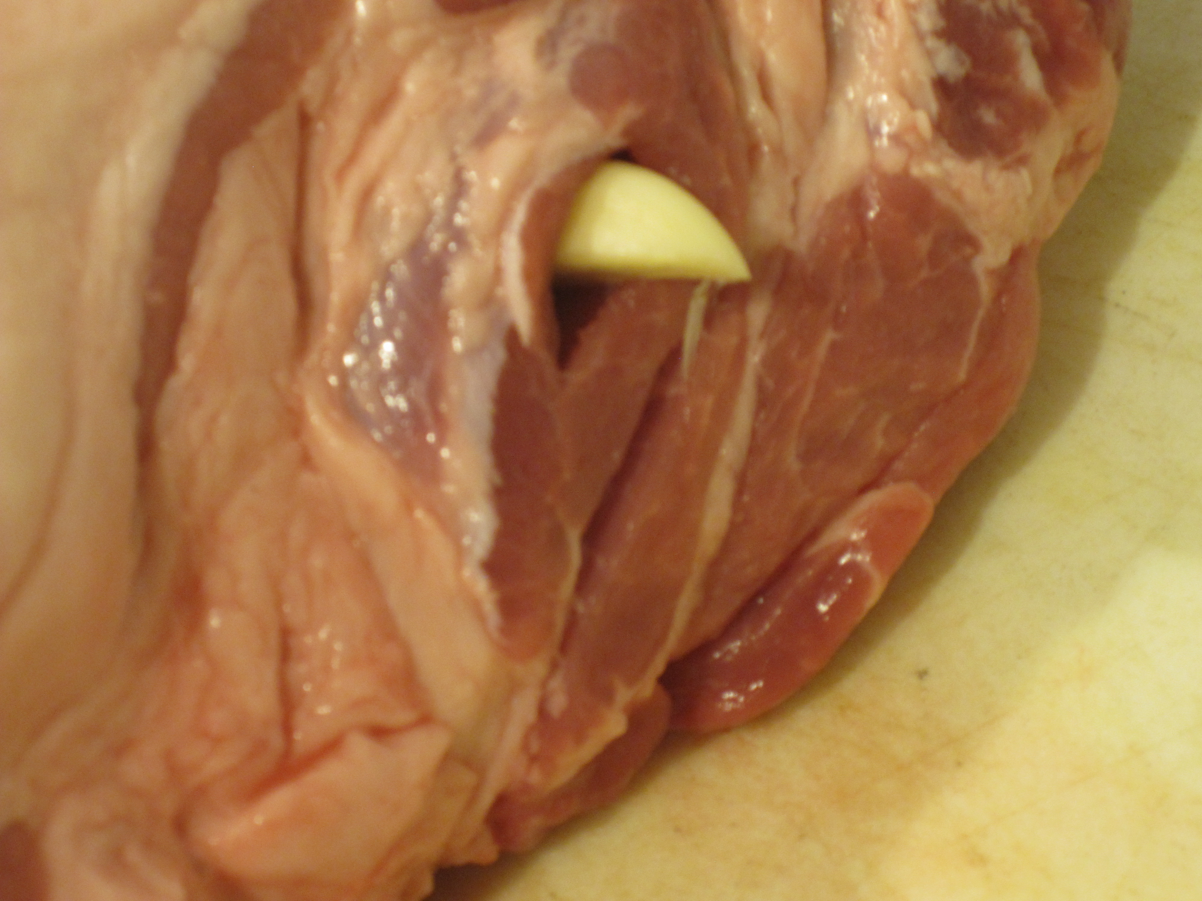 Next I took about 8 cloves of garlic and cut them in half.  Then I cut small slits throughout the meat and put the garlic in, making sure it was deep enough that it could not be seen.