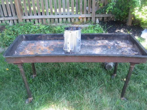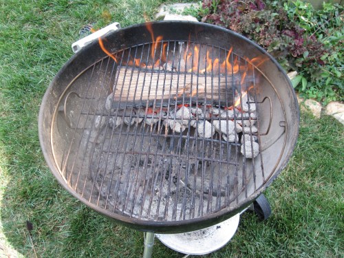 I put down a base of charcoal and a few small logs on top as added fuel and to get a smoky flavor.  I kept all of these to one side and started them up planning to put the pork on in about a half an hour.